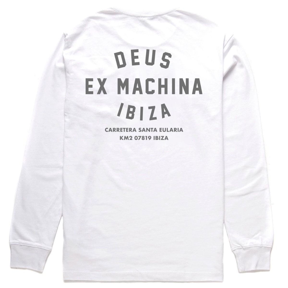 Esta camiseta de ajuste regular, perteneciente a la colección "Deus Ex Machina Classics", cuenta con cuello redondo, manga larga, el logo de Deus en el pecho y la leyenda “Deus Ex Machina Carretera de Santa Eularia, Km 2, 07819 Ibiza” en la espalda.