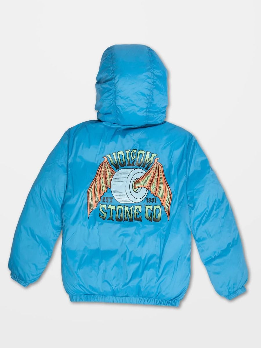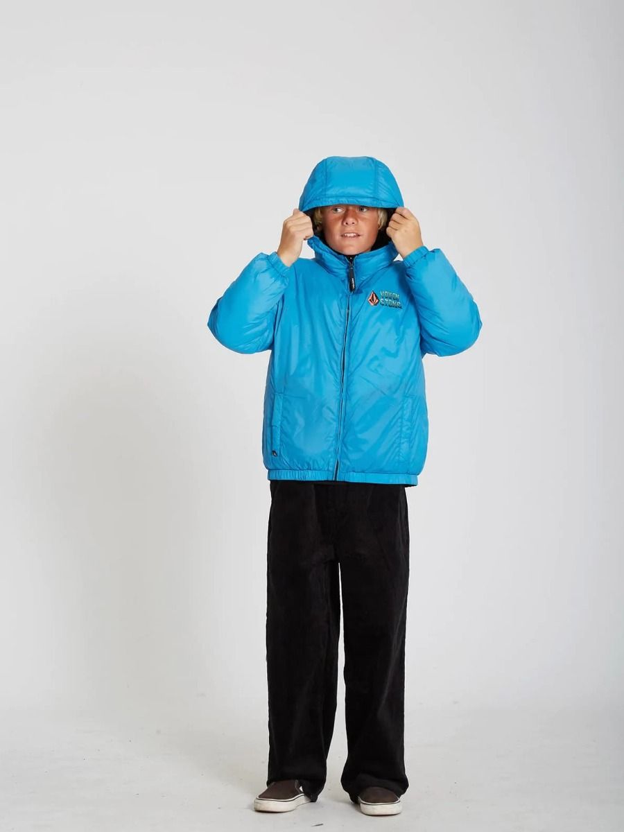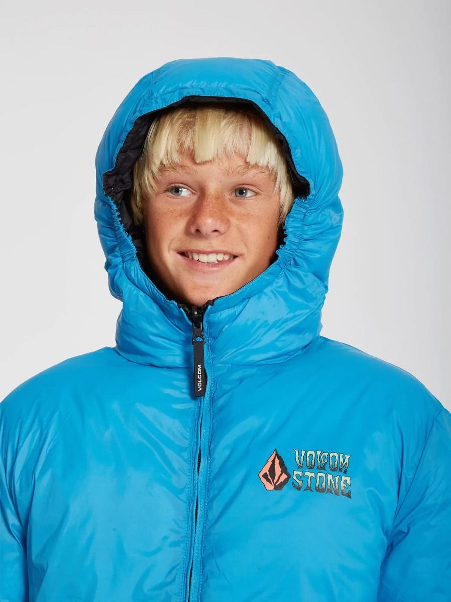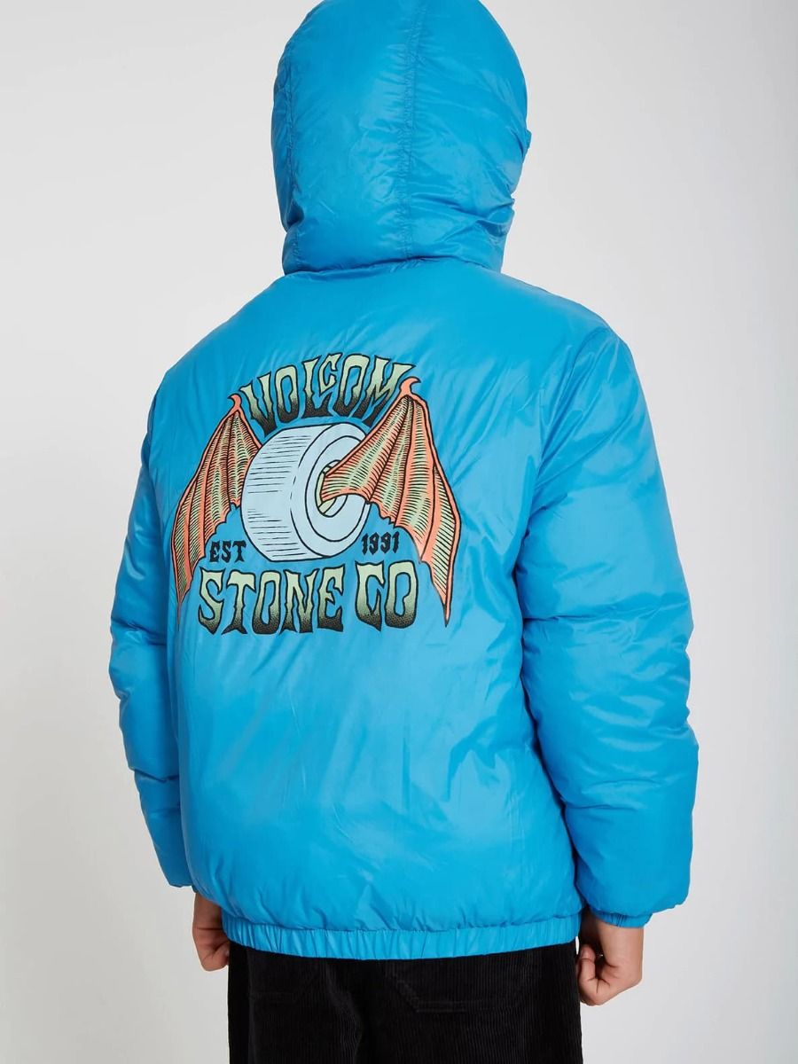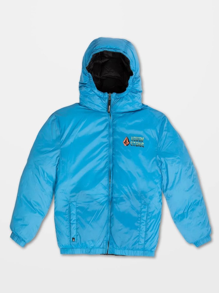 Esta chaqueta de corte holgado cuenta con capucha con revestimiento elástico, cuello medio alto, cierre frontal de cremallera, bolsillos laterales en ambos lados, puños y dobladillo inferior elásticos, estampado Volcom en el lado izquierdo del pecho y estampado serigrafiado Volcom Stone Co. en el lado reversible del pecho y la espalda.