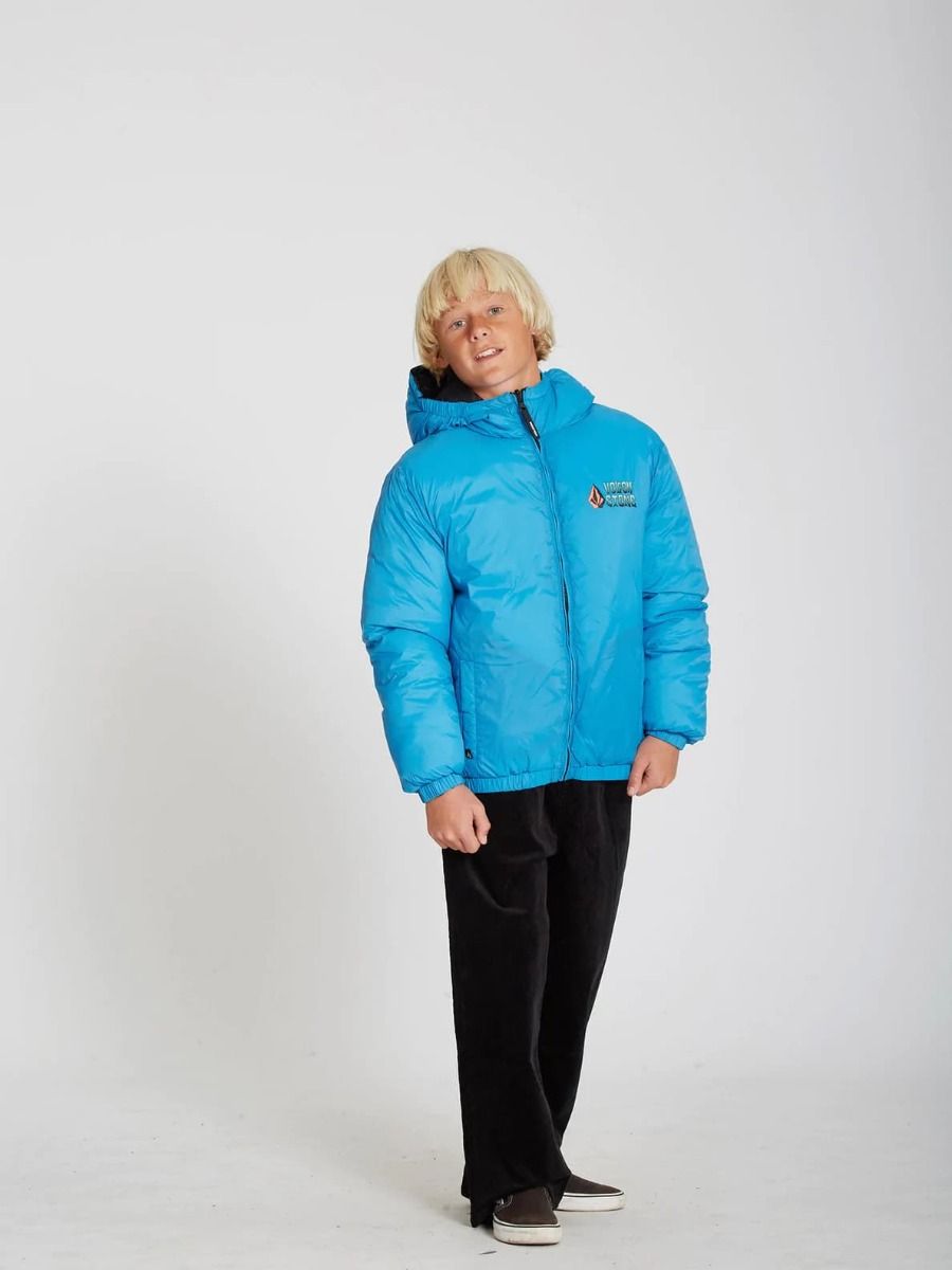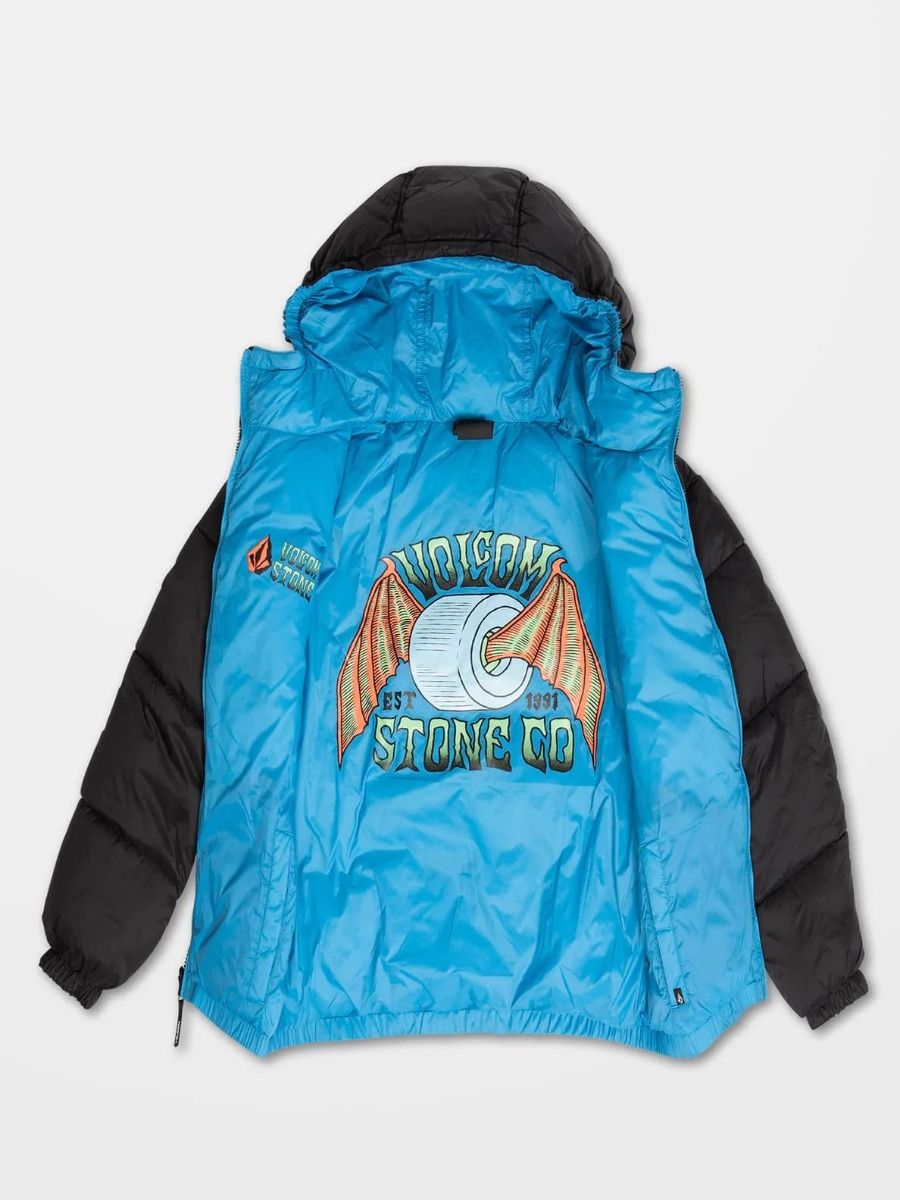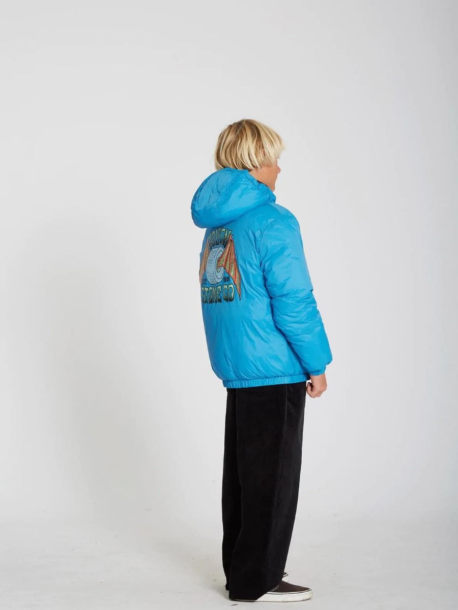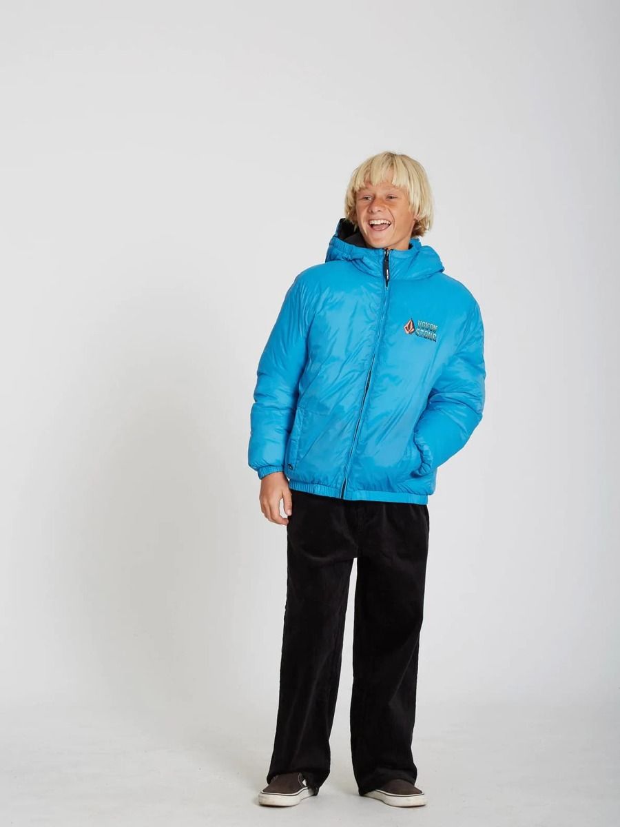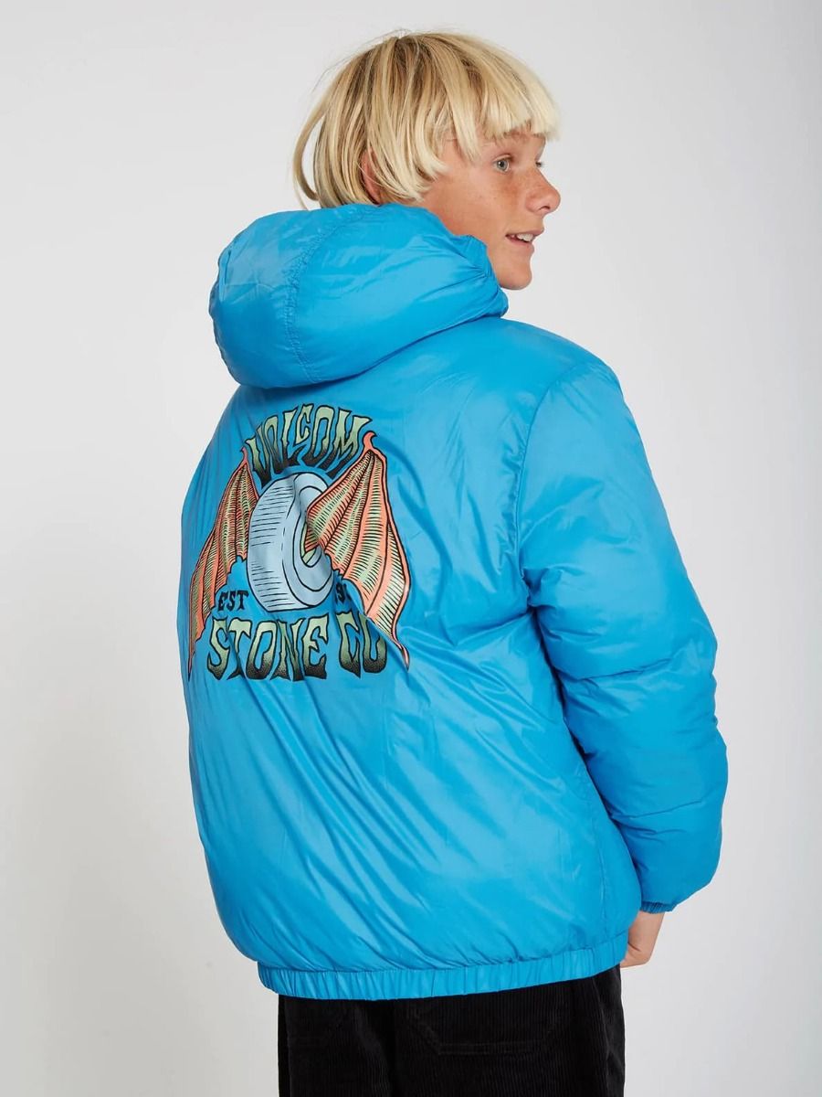 Esta chaqueta de corte holgado cuenta con capucha con revestimiento elástico, cuello medio alto, cierre frontal de cremallera, bolsillos laterales en ambos lados, puños y dobladillo inferior elásticos, estampado Volcom en el lado izquierdo del pecho y estampado serigrafiado Volcom Stone Co. en el lado reversible del pecho y la espalda.