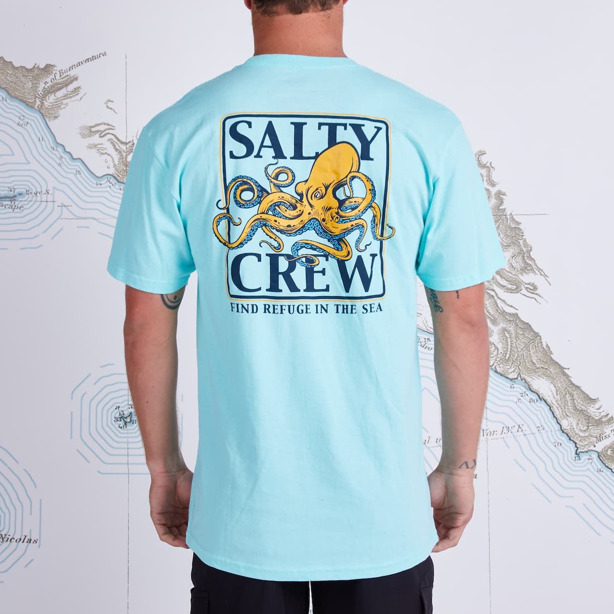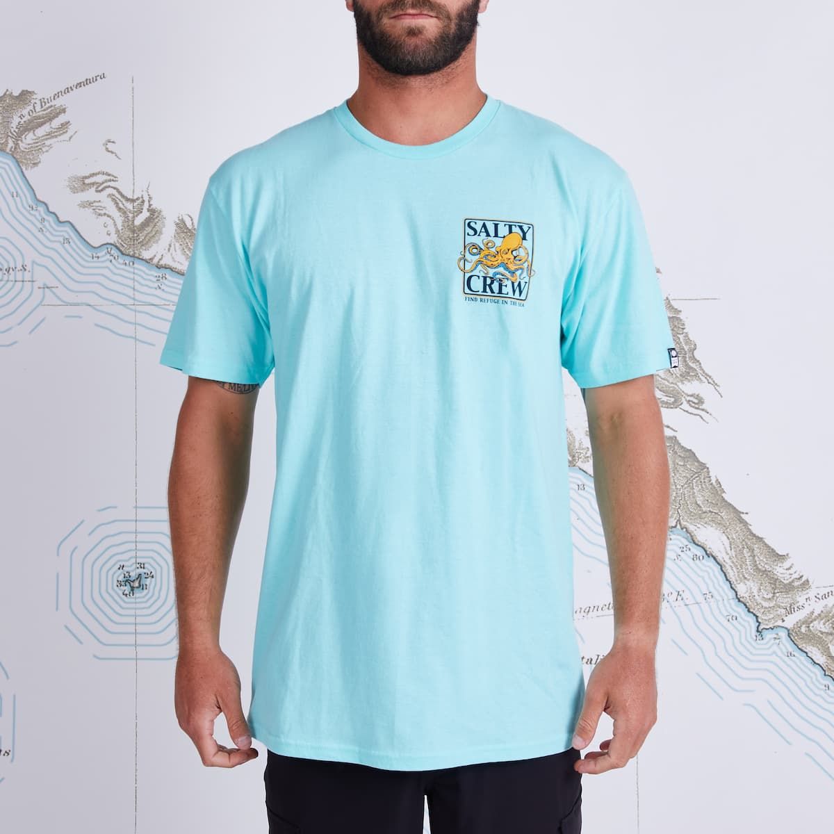 Esta camiseta de tejido suave cuenta con cuello redondo, manga corta y estampado original de Salty Crew de un pulpo junto con la leyenda "Find refuge in the sea” (Encuentra refugio en el mar) serigrafiados en el lado izquierdo del pecho y en la espalda.