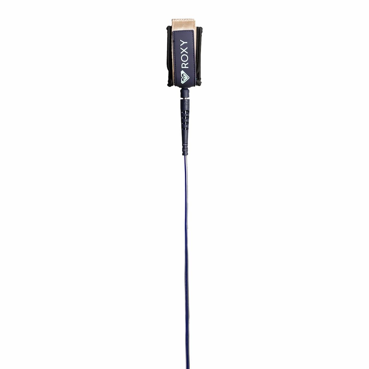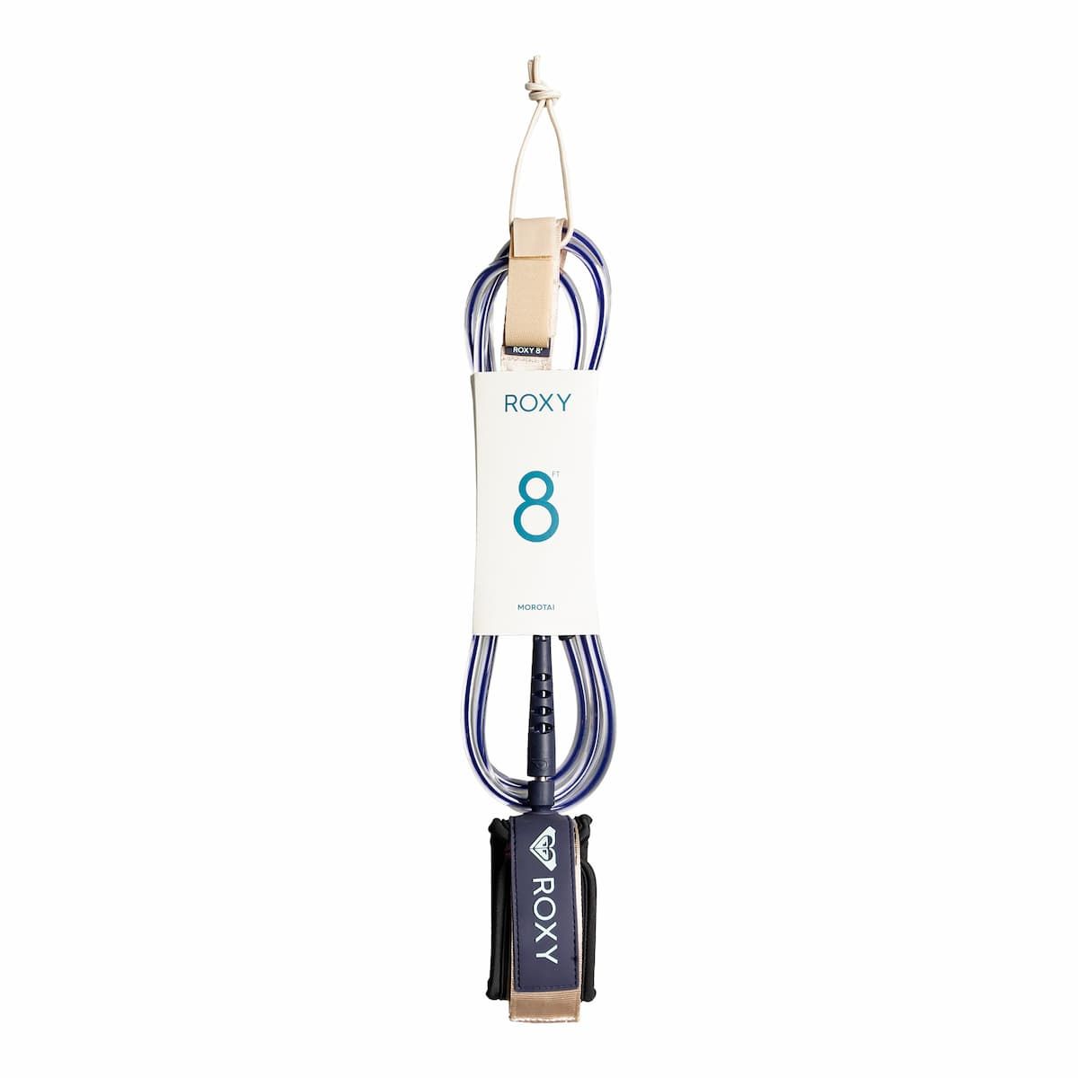 El leash Roxy Morotai 8' azul cuenta con tobillera acolchada de neopreno, un fuerte cordón de 8 mm de diámetro, cierre autoadherente, doble giravueltas anti-enredos de acero inoxidable y tira de seguridad moldeada en silicona para soltarlo fácilmente.