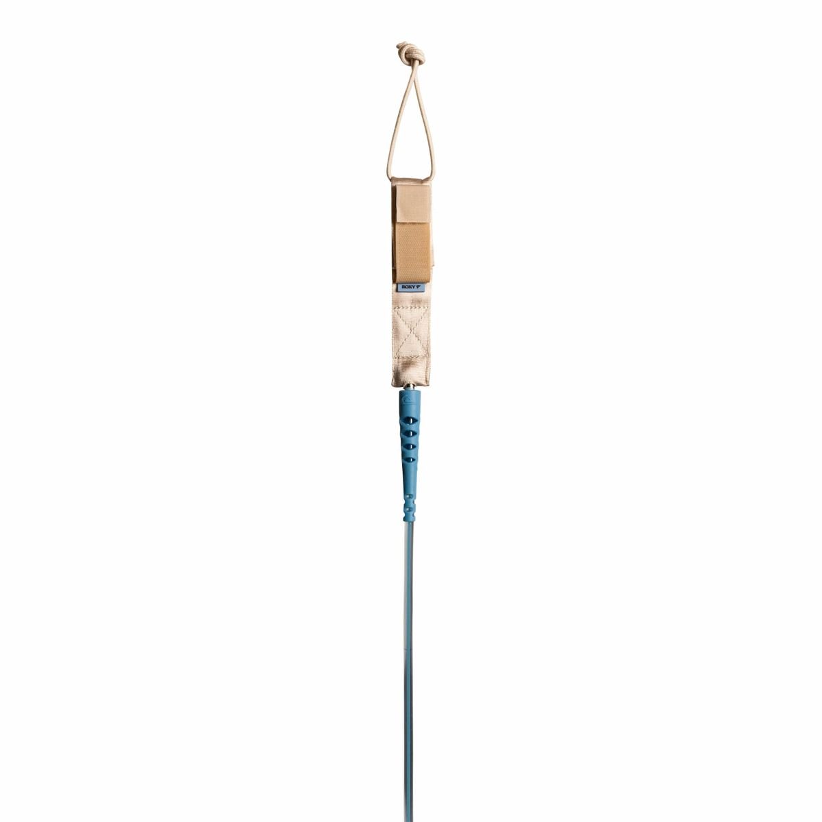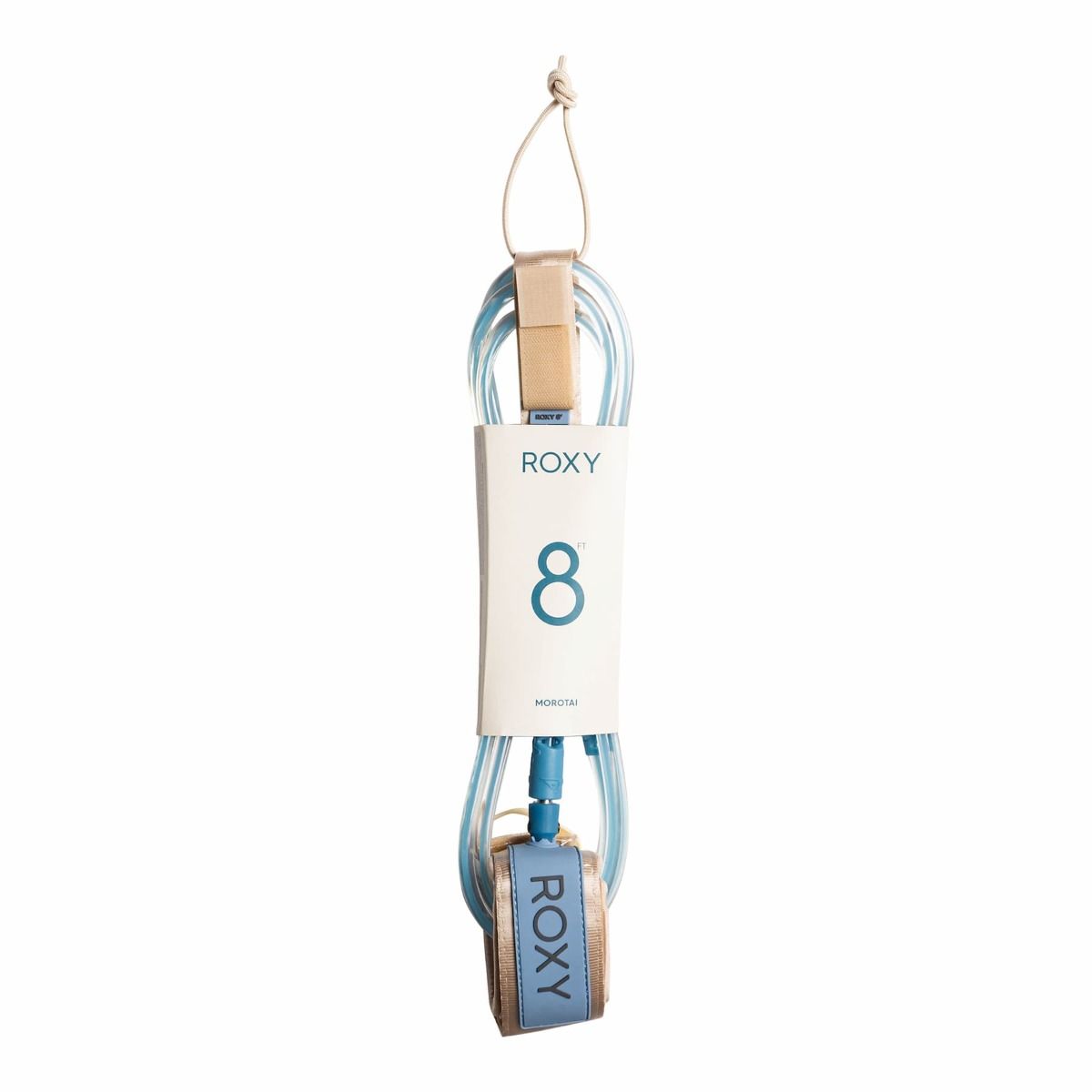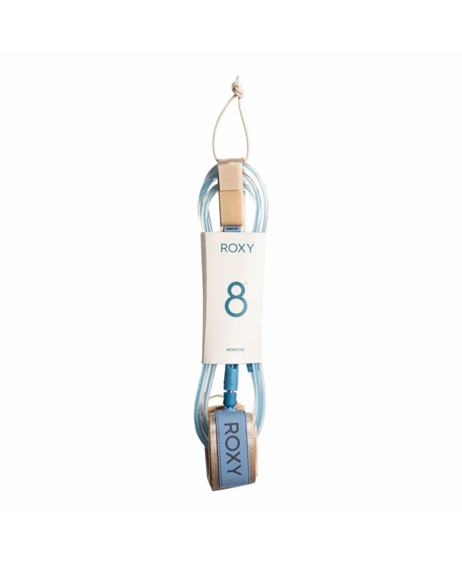 El leash Roxy Morotai 8' azul claro cuenta con tobillera acolchada de neopreno, un fuerte cordón de 8 mm de diámetro, cierre autoadherente, doble giravueltas anti-enredos de acero inoxidable y tira de seguridad moldeada en silicona para soltarlo fácilmente.