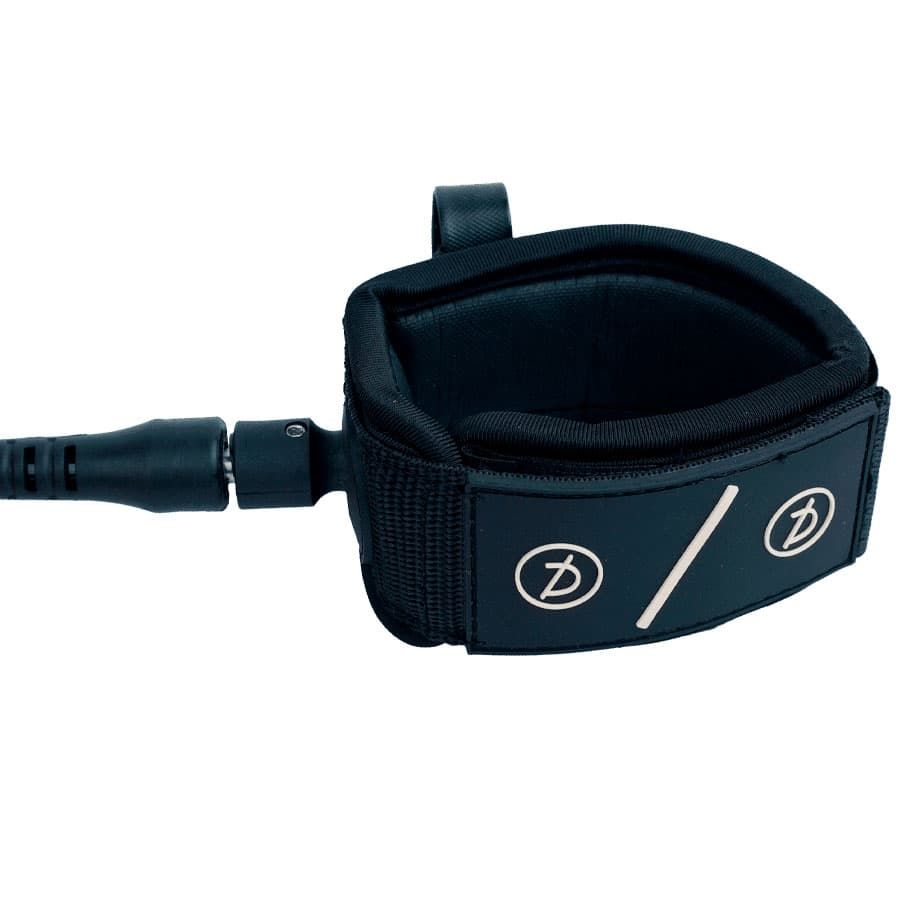 Este leash de 8 pies de largo y 7mm de espesor cuenta con cierre de velcro con parche extra para mayor agarre, eslabones giratorios de acero inoxidable y tobillera de neopreno con interior antideslizante.
