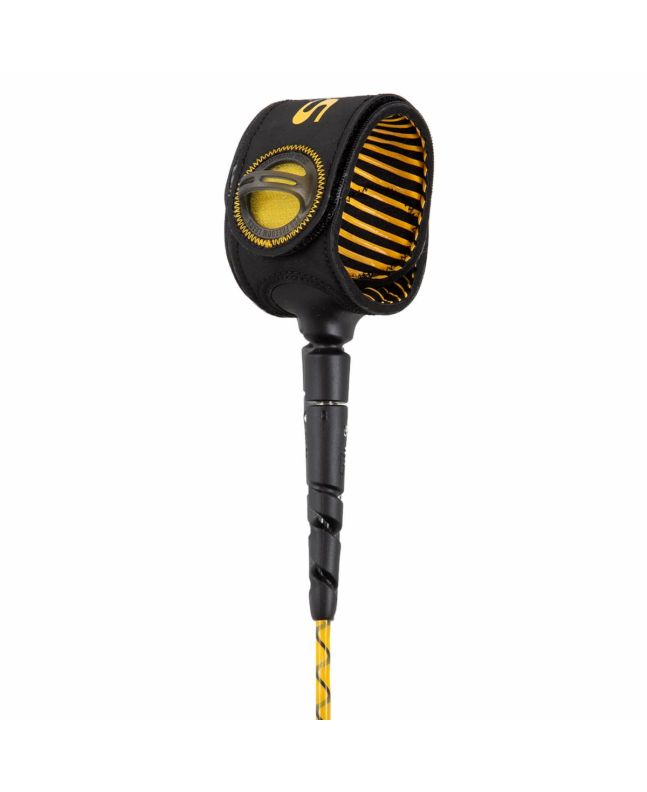 Este leash de surf cuenta con un fuerte cable de 5 mm de diámetro con construcción en hélice interna que se endereza bajo carga para absorber los impactos y aumentar la resistencia, junto con una superficie texturizada que crea un flujo de agua más suave para reducir la fricción.