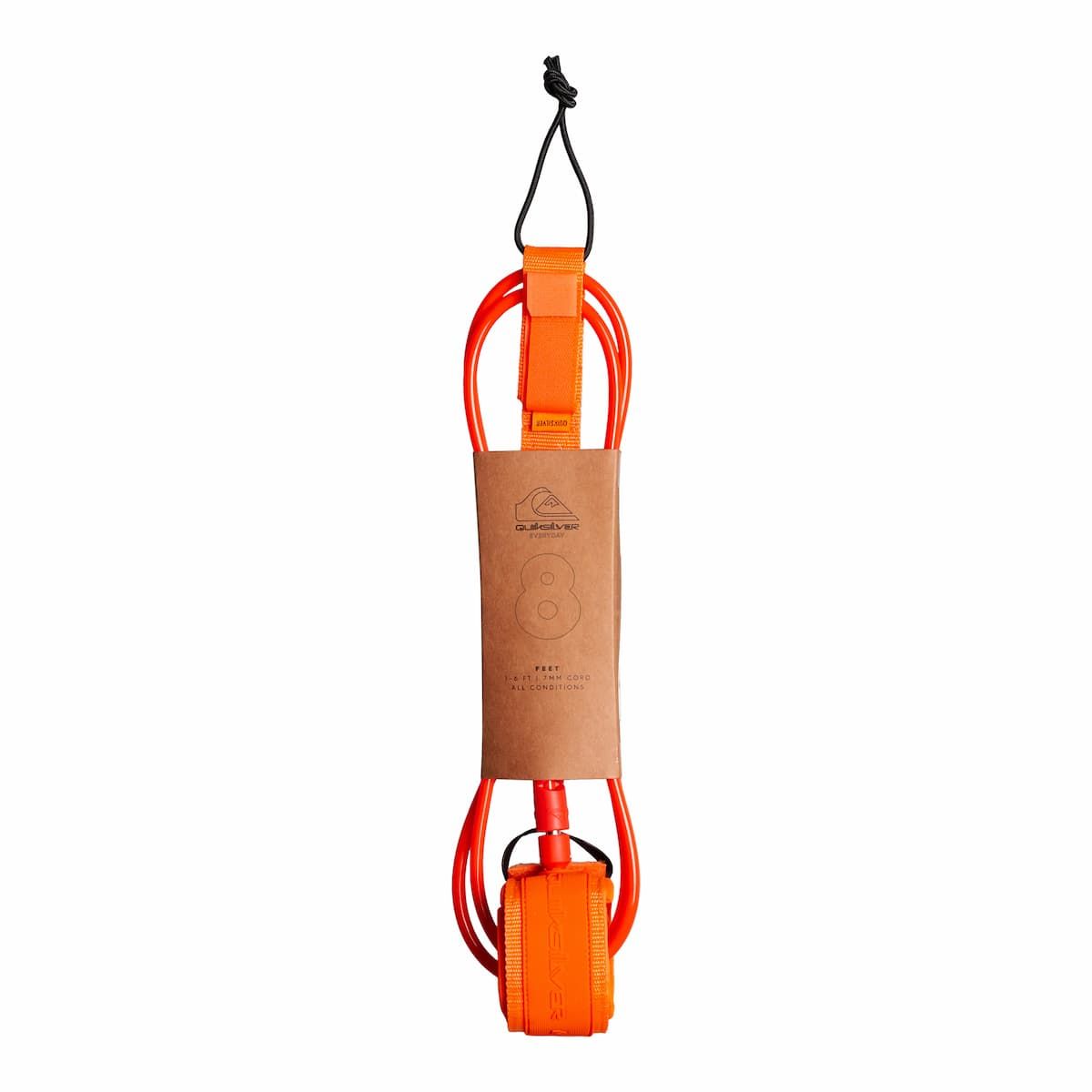 El leash Quiksilver Everyday 8' Naranja cuenta con una tobillera acolchada de neopreno, un fuerte cordón resistente a las roturas y al agrietamiento de 7mm de diámetro, doble giravueltas de acero inoxidable para eliminar torsiones, lengüeta de liberación rápida en caso de emergencia, cierre autoadherente de velcro, un bolsillo oculto en el puño para guardar una llave y cuerno moldeado para mantener el cordón alejado de tus pies.