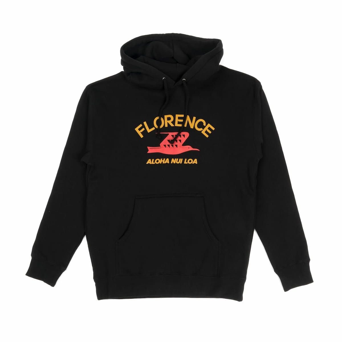 Este hoodie negro cuenta con forro interior, capucha ajustable mediante cordón, un bolsillo tipo canguro, punto canalé en puños y dobladillo inferior, un gráfico de una gaviota con la inscripción FLORENCE ALOHA NUI LOA serigrafiados en la parte delantera.
