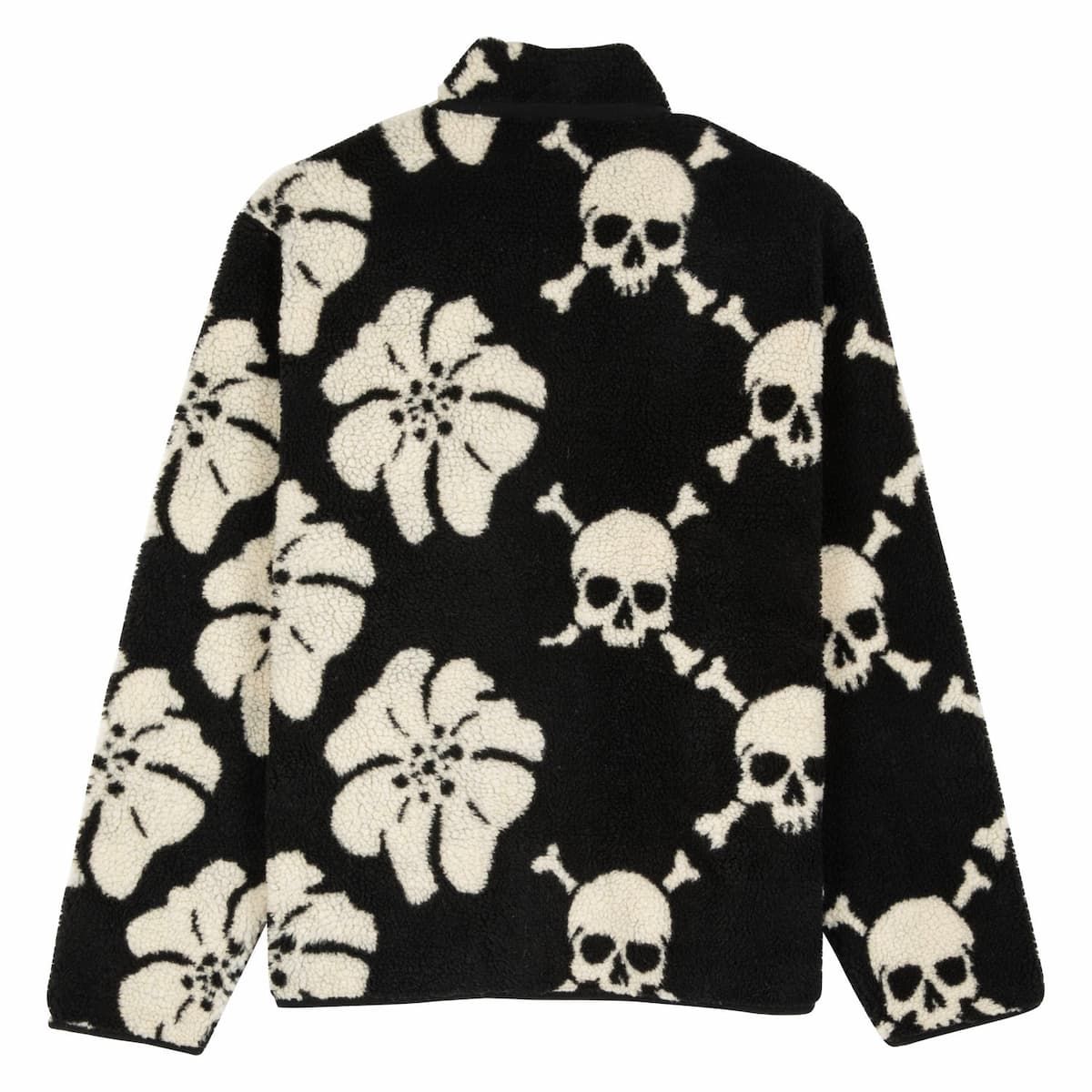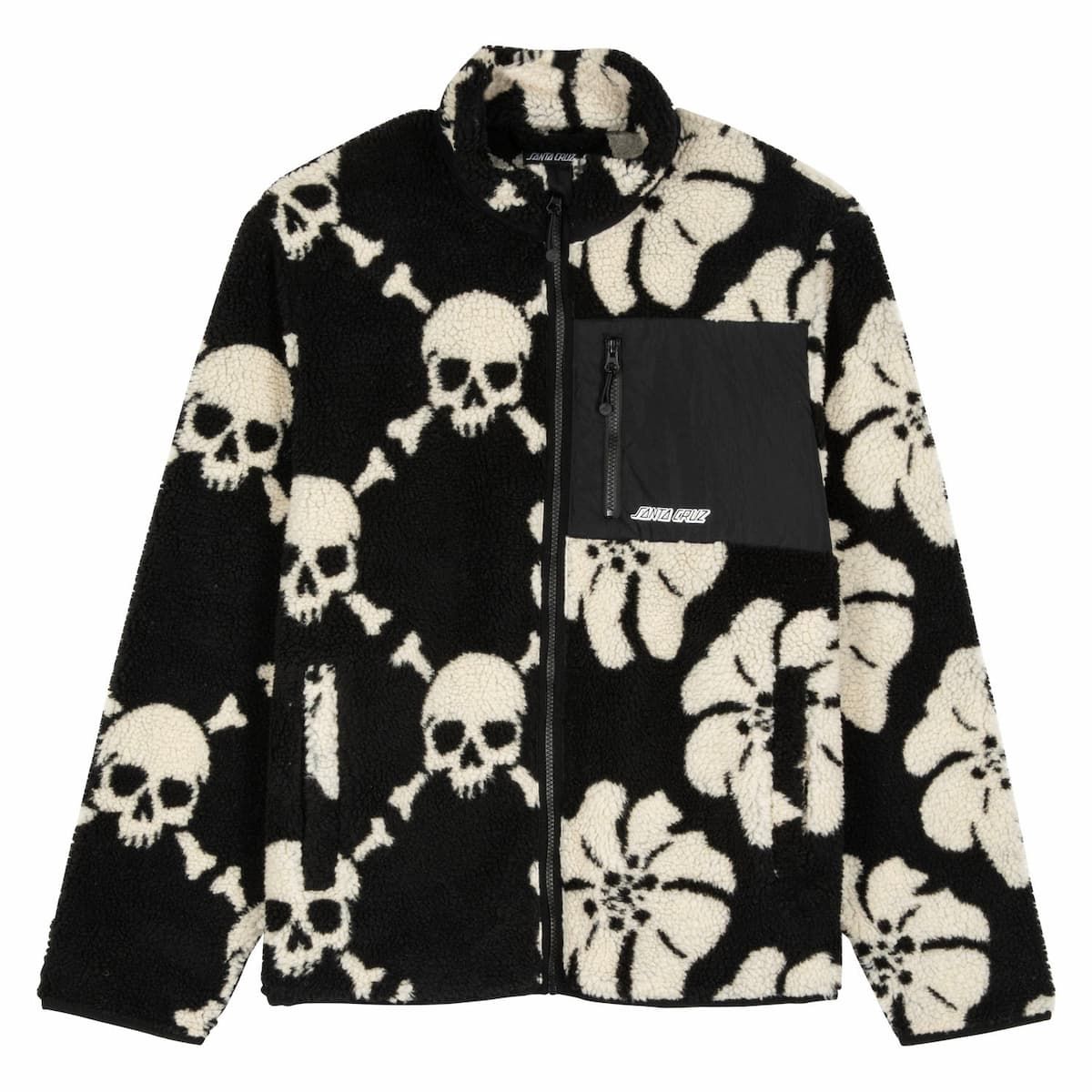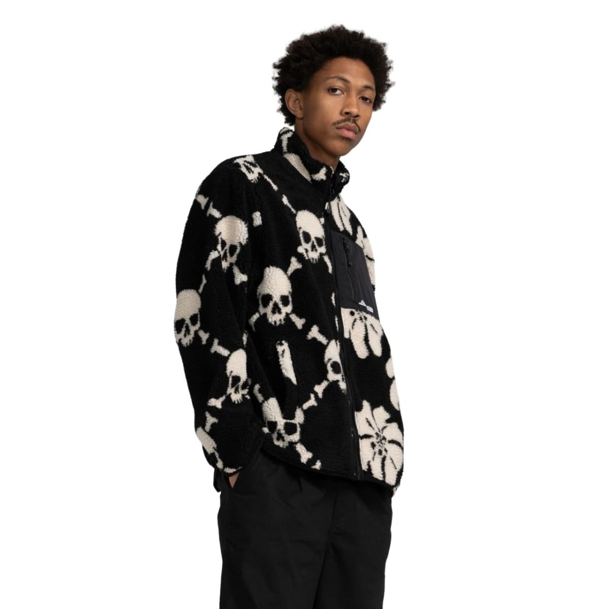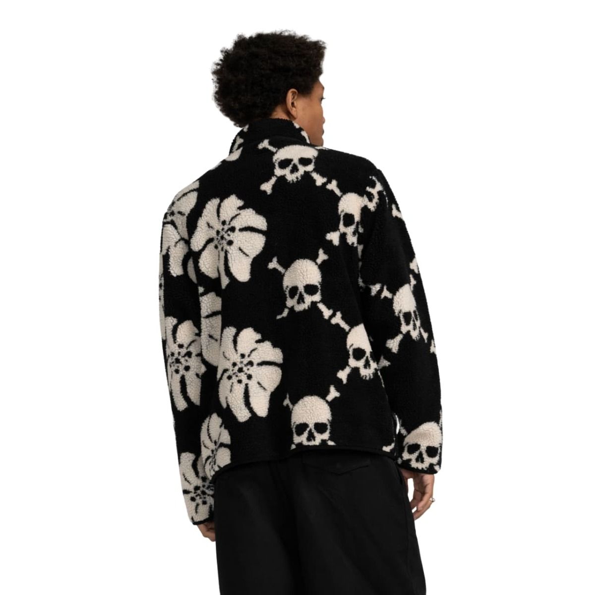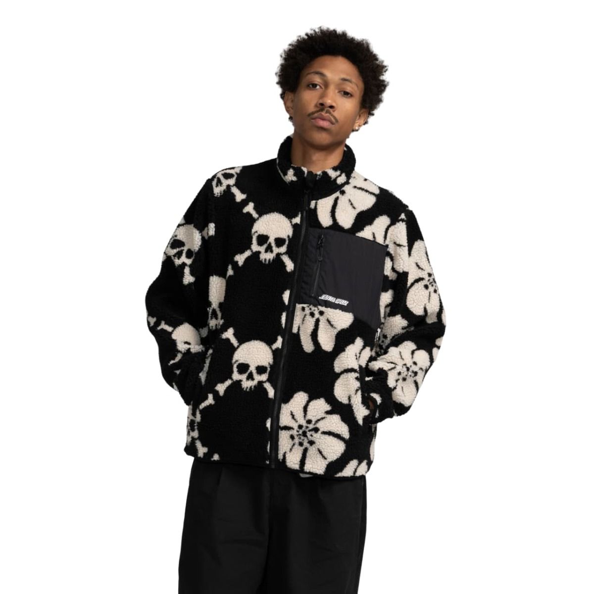 Este forro polar tipo chaqueta cuenta cálido y suave forro polar sherpa, cierre frontal de cremallera completa, ribetes en el cuello, dobladillo y puños, un bolsillo en el pecho con cremallera, bolsillos laterales y estampado por toda la prenda de calaveras y flores inspirado en el rider freestyle Ray Meyer.