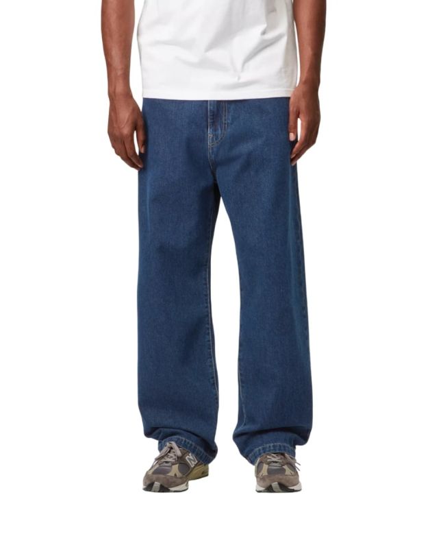 Pantalón vaquero Carhartt WIP en denim lavado a la piedra, resistente y cómodo con corte loose tapered para uso urbano diario.