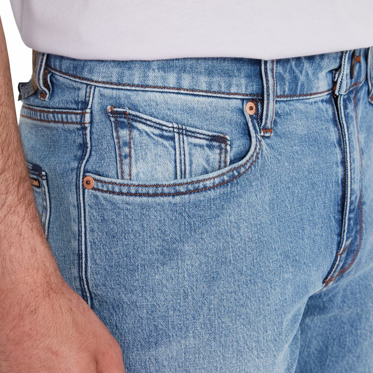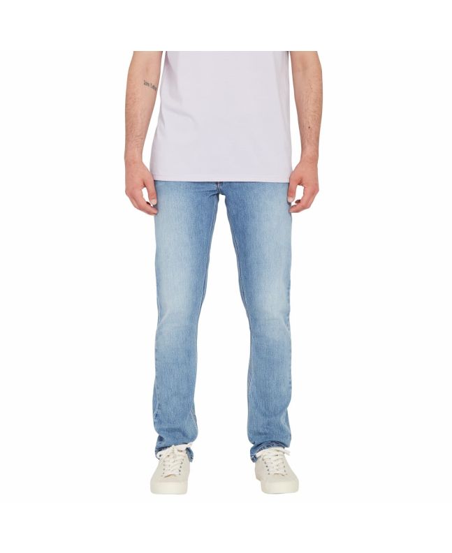 Estos vaqueros para hombre de corte slim y tiro normal, cuentan con pernera recta con una abertura de 38cm, tejido vaquero índigo jaspeado con un efecto desgastado intenso en los muslos y más ligero en los bolsillos y el dobladillo, junto con los detalles característicos de Volcom Brand Jeans.