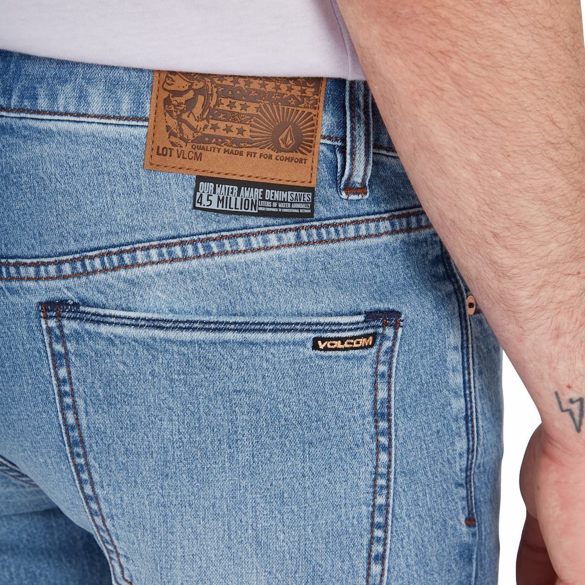 Los pantalones vaqueros Vorta Denim en azul jaspeado han sido sometidos a lavado enzimático sin suavizantes mediante técnicas de lavado con ozono y enzimas para limitar el consumo de agua (Volcom Water Aware).