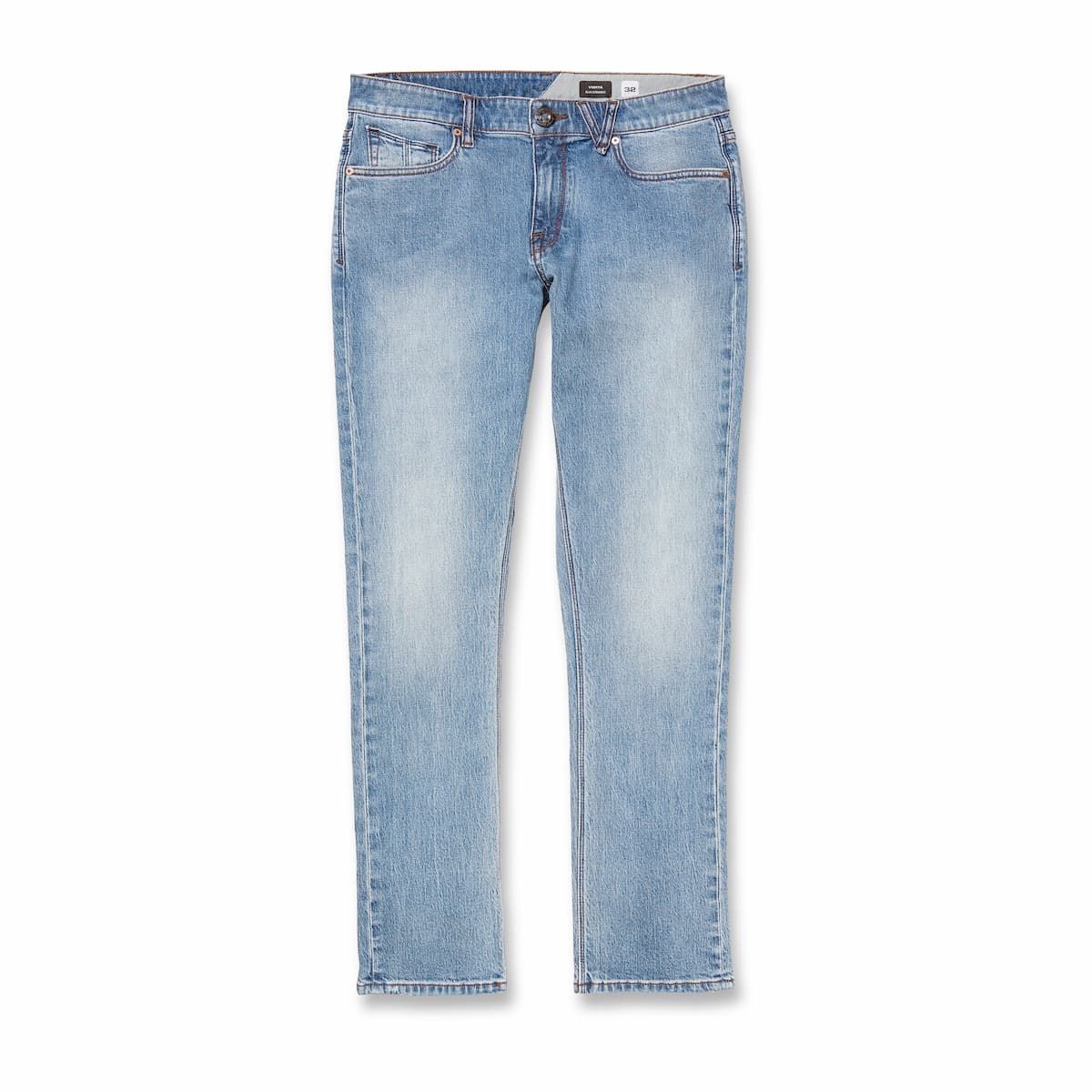 Los jeans Vorta Denim Wrecked Indigo para hombre tienen una etiqueta de garantía Volcom en la cintura interior.