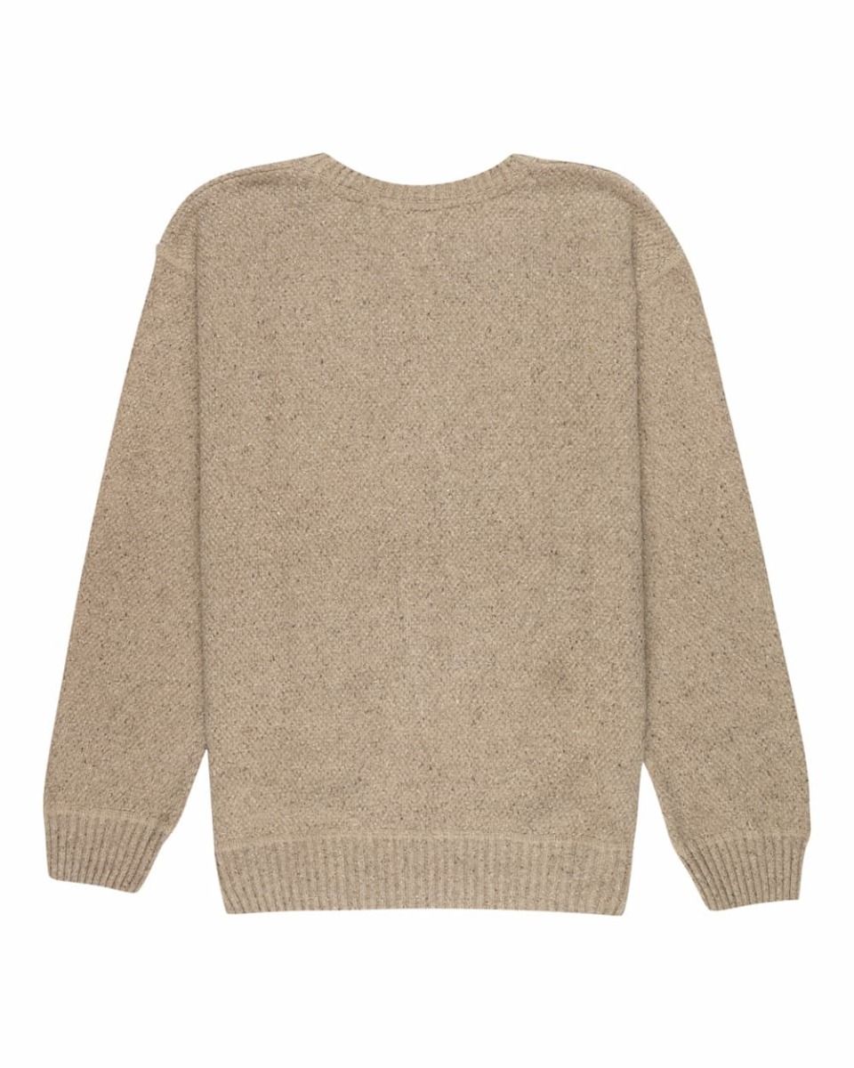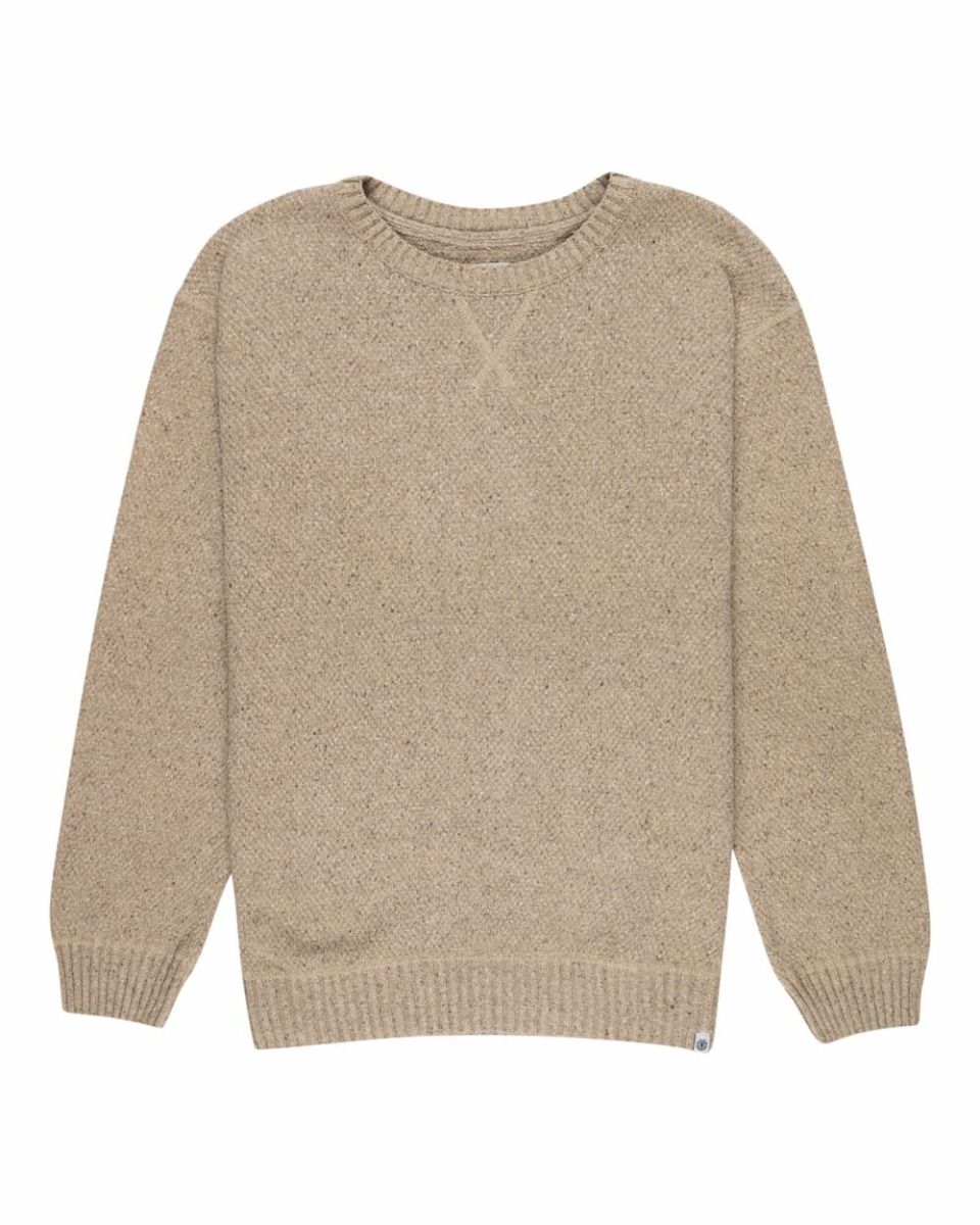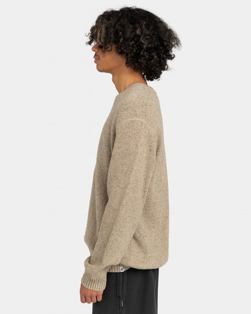 Este cálido suéter de corte normal cuenta con diseño cerrado, hilo Filatures du Parc, cuello redondo, punto canalé en puños y dobladillo, junto con un parche de tela con el logo de Element tejido en el dobladillo.