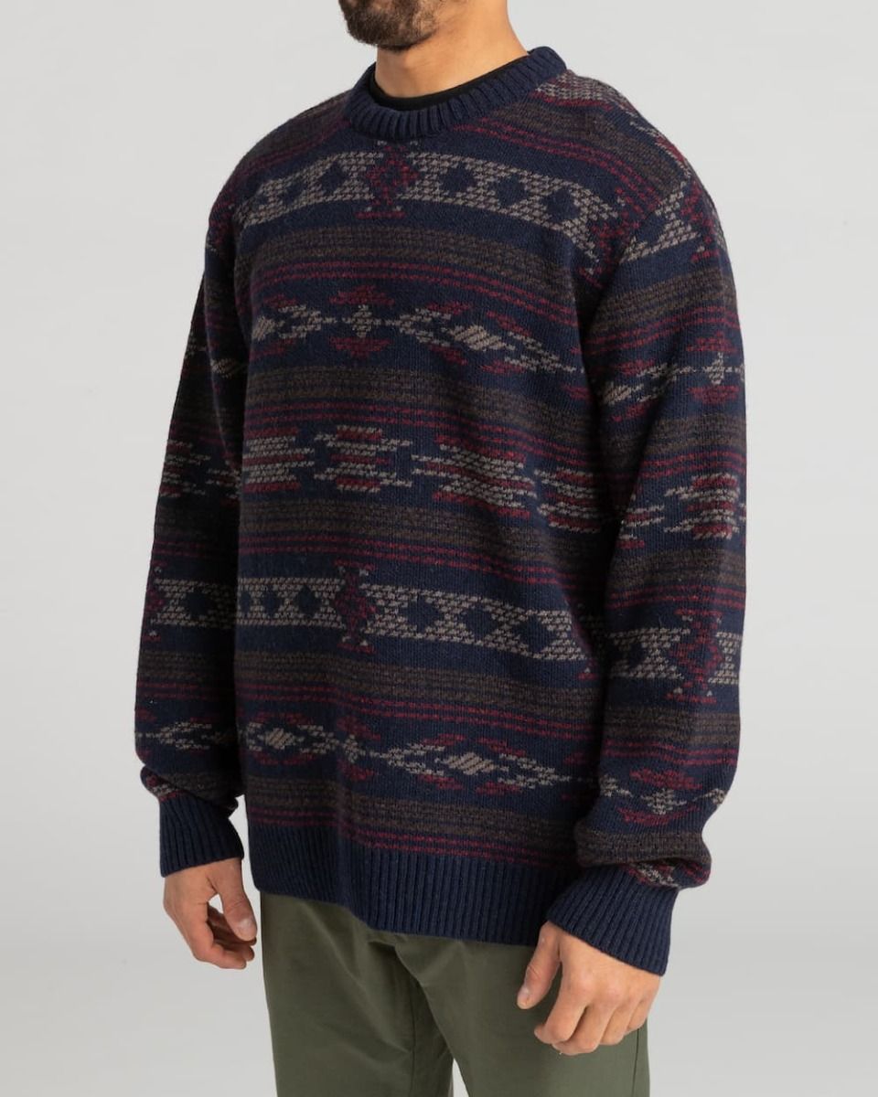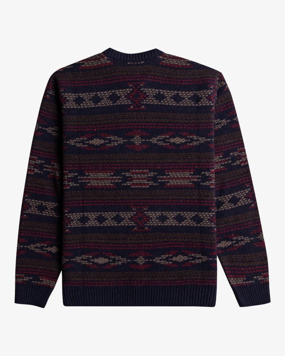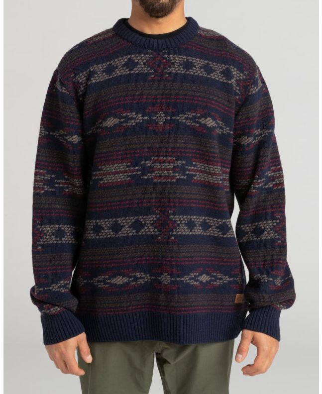El jersey para hombre Ranchero Crew en azul marino (Navy) de Billabong está confeccionado con hilos reciclados (64% poliacrílico, 22% lana, 9% poliamida y 5% otros).