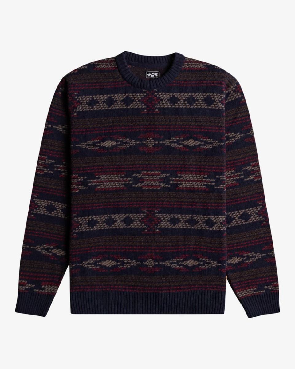 Este suéter sostenible de corte normal cuenta con cuello redondo, punto canalé en puños y dobladillo, cepillado ligero para un look y una sensación vintage, diseño en Jacquard con motivos tribales y un parche de cuero sintético con el logo de Billabong tejido en el dobladillo.