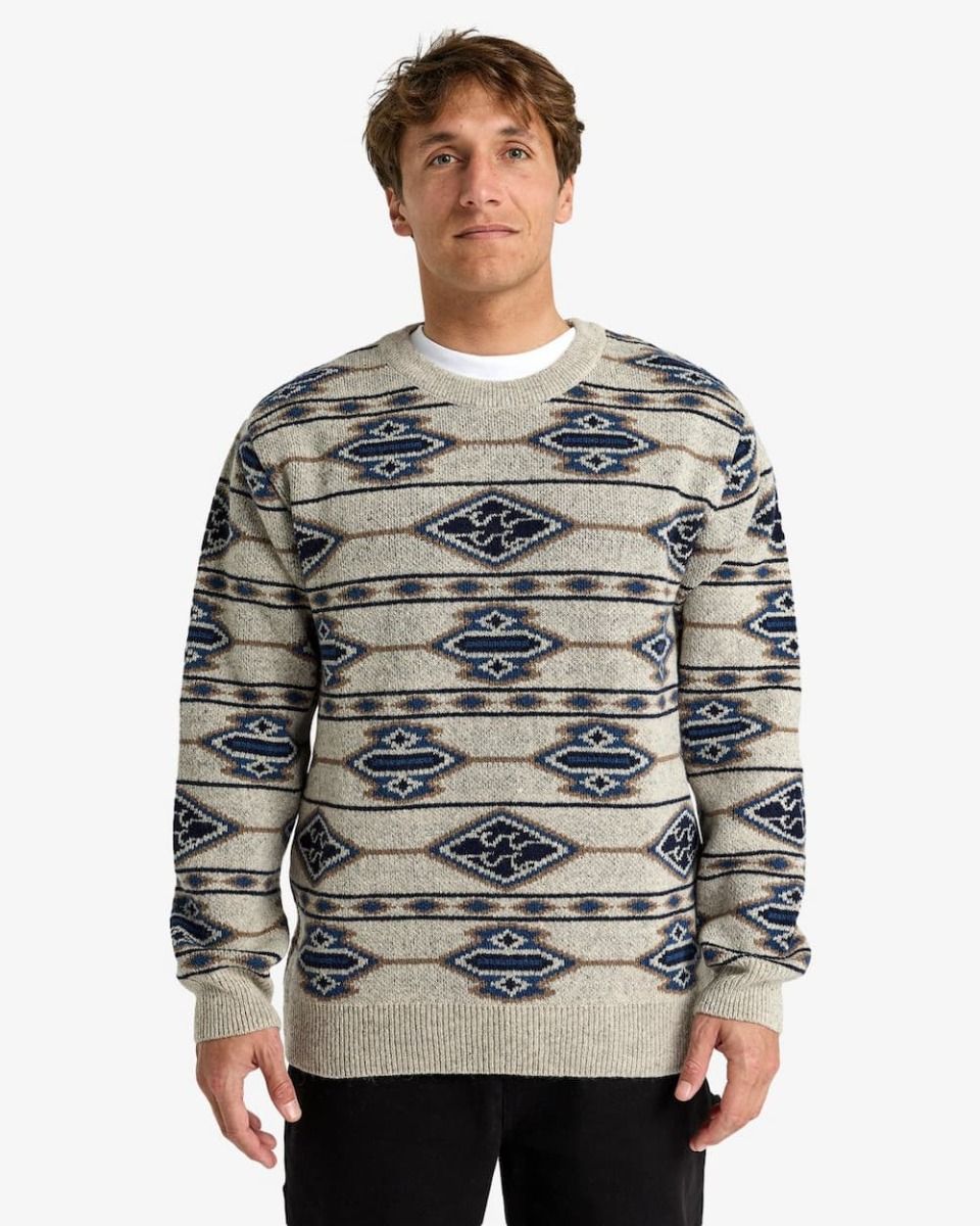 Este suéter sostenible de corte clásico cuenta con cuello redondo, punto canalé en puños y dobladillo, cepillado ligero para un look y una sensación vintage, diseño en Jacquard con motivos tribales y una etiqueta con el logo de Billabong tejida en el dobladillo.