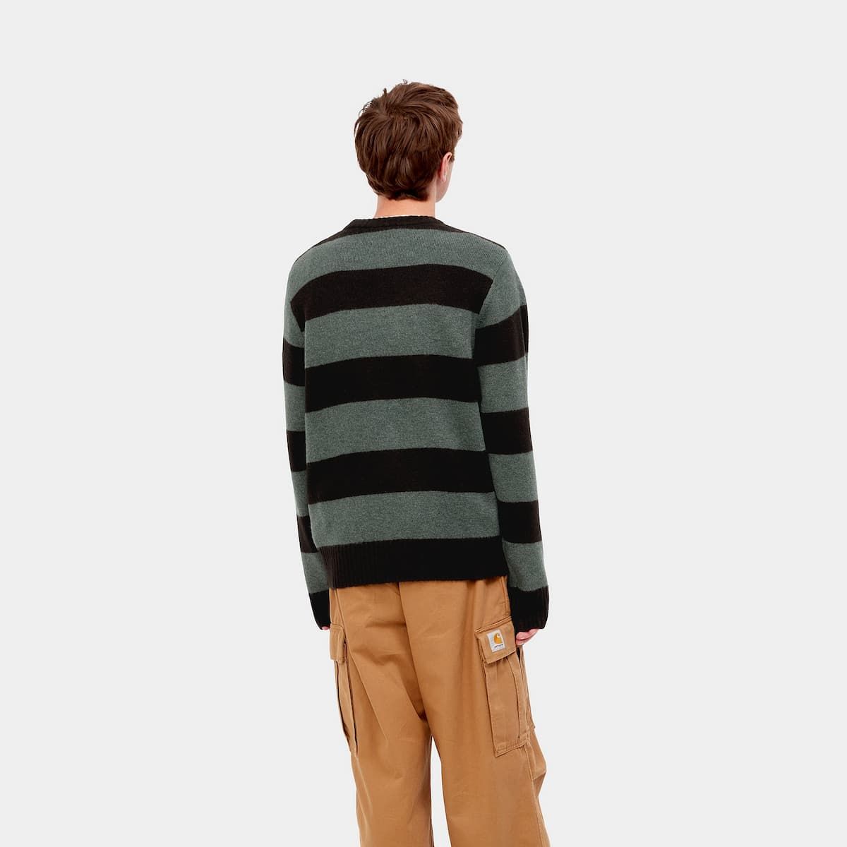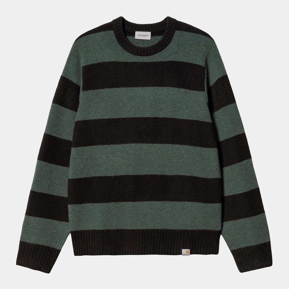 Este suéter de ajuste regular cuenta con cuello redondo, diseño a rayas en toda la prenda, fibras teñidas en hilo para mayor intensidad y duración del color, junto con una etiqueta de tela con el logo de Carhartt tejida en el dobladillo.