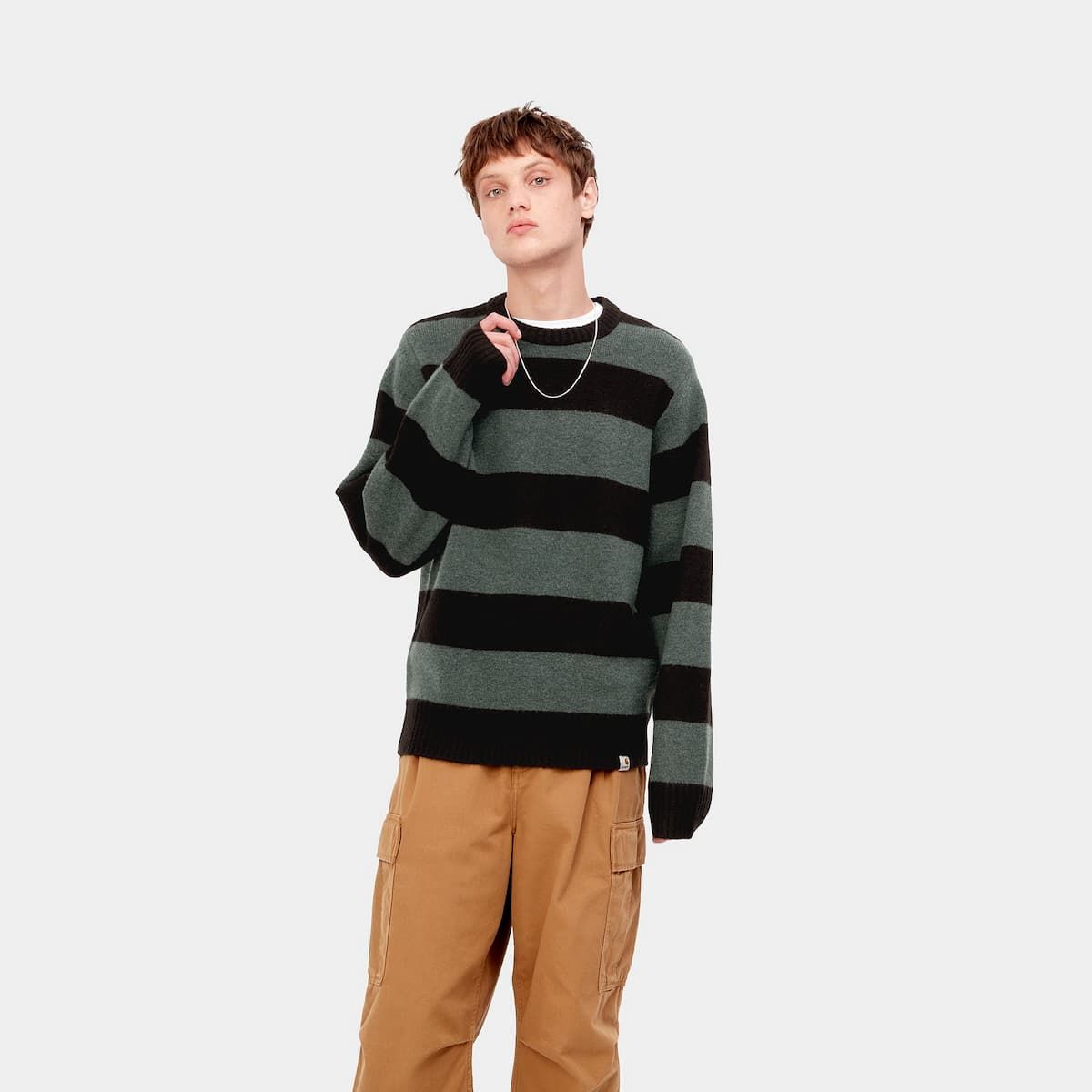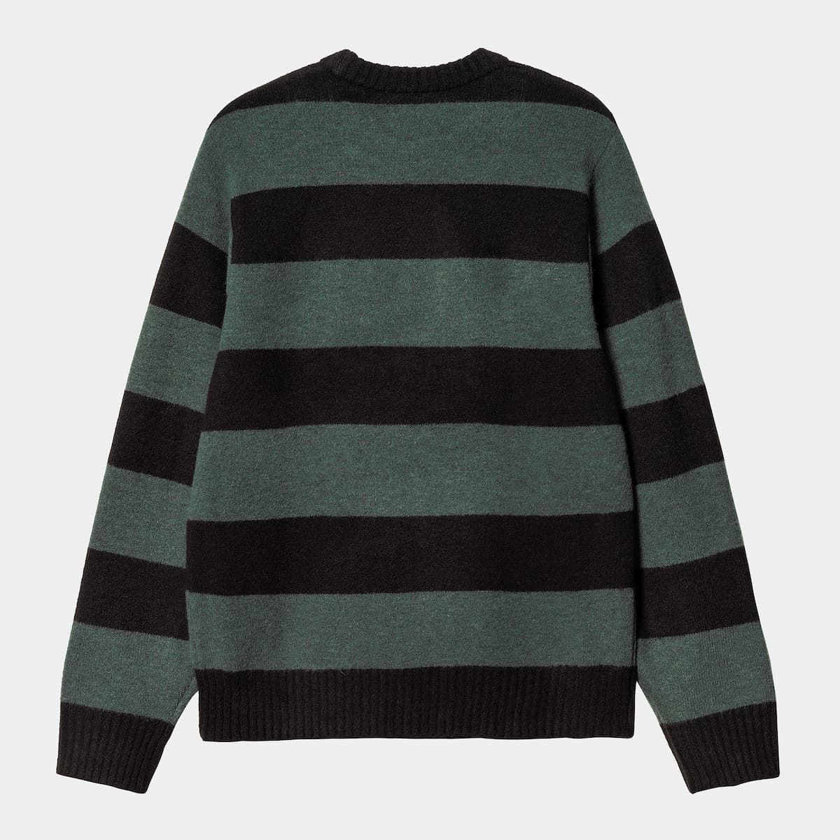 El jersey para hombre Jagger Sweater en verde a rayas (Jagger Stripe-Juniper Heather) de Carhartt WIP está confeccionado con mezcla de 54% hilo acrílico, 36% nailon, 6% lana y 4% elastano de calibre 7.
