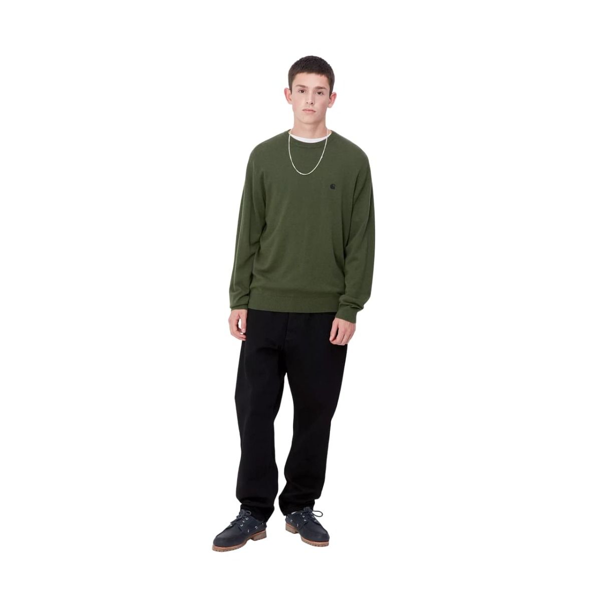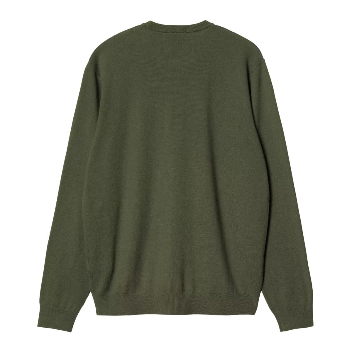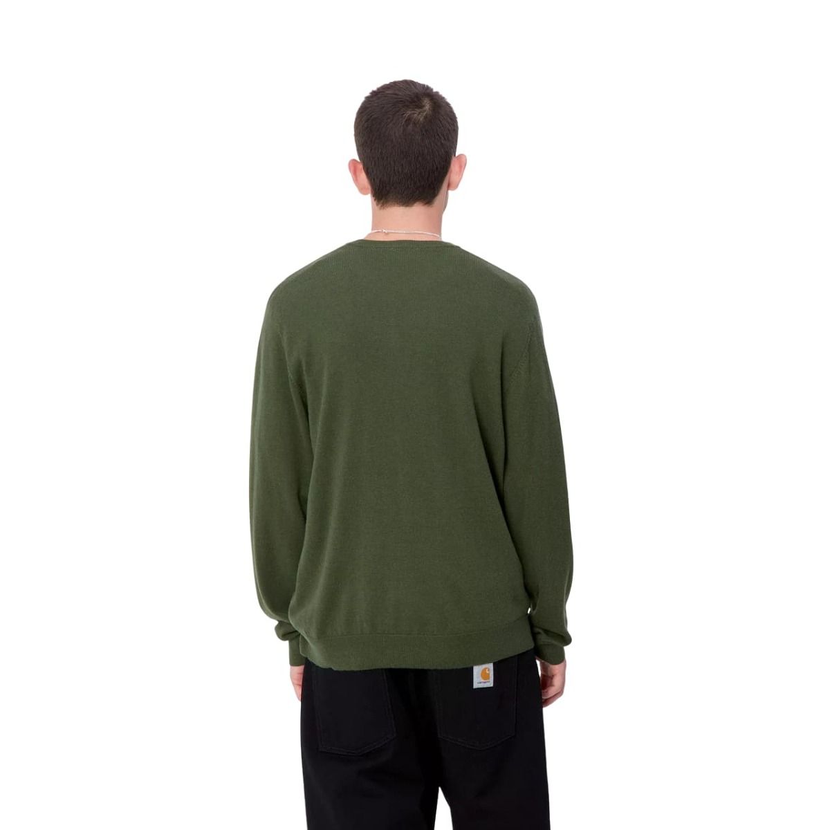 Este cálido suéter de lana color verde estragón de corte clásico cuenta con cuello redondo, punto canalé en el cuello, el dobladillo y los puños, junto con el logo de la "C" de Carhartt bordado en tono negro en el lado izquierdo del pecho.