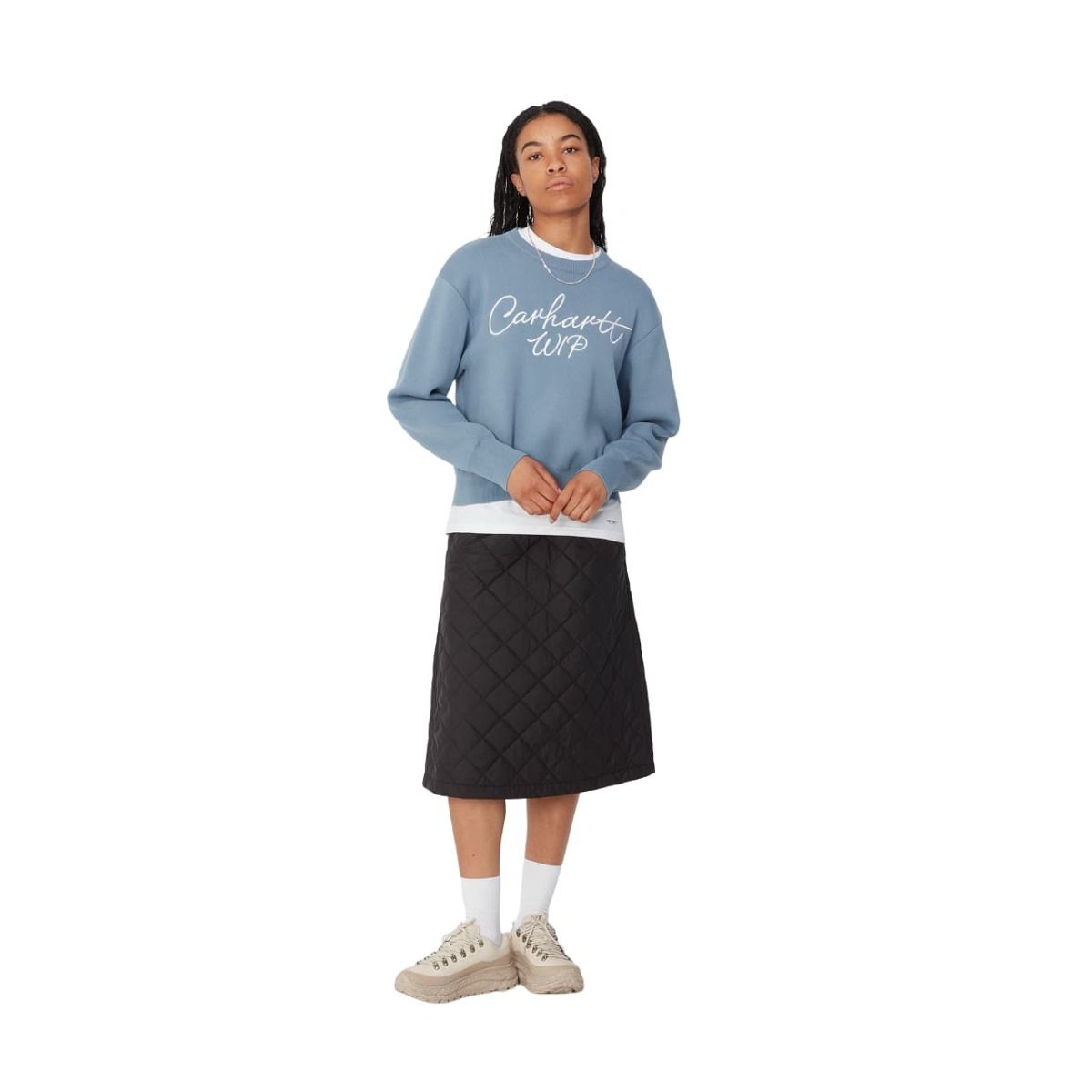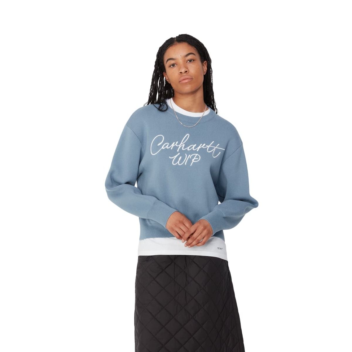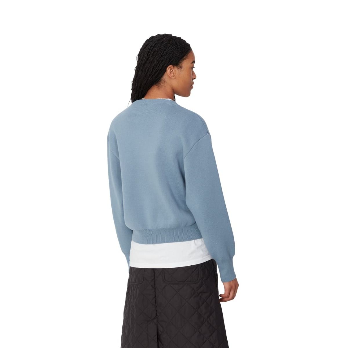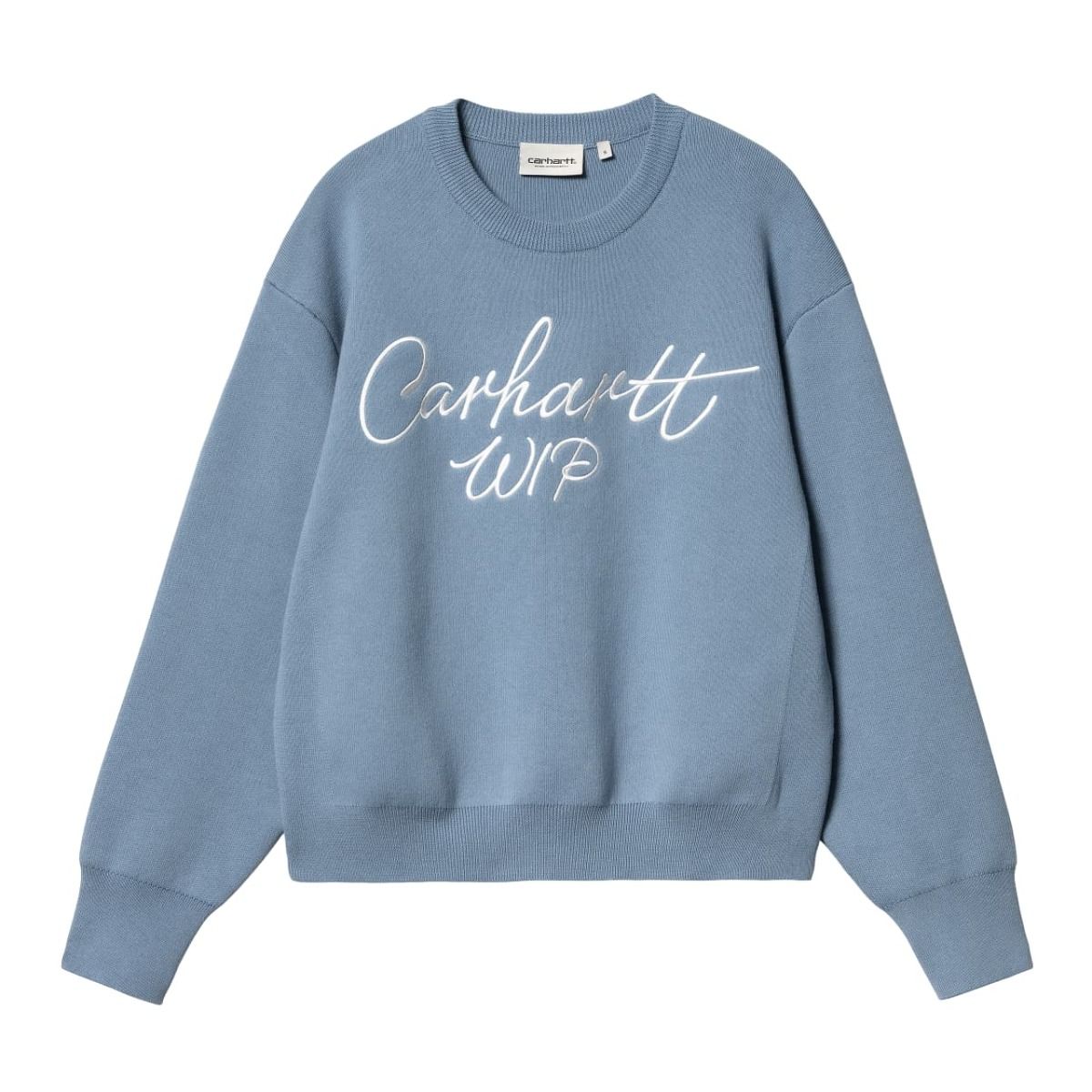 Este suéter ligero azulado presenta un diseño de hombros caídos, cuello redondo, junto con bordado Carhartt WIP en la parte delantera.