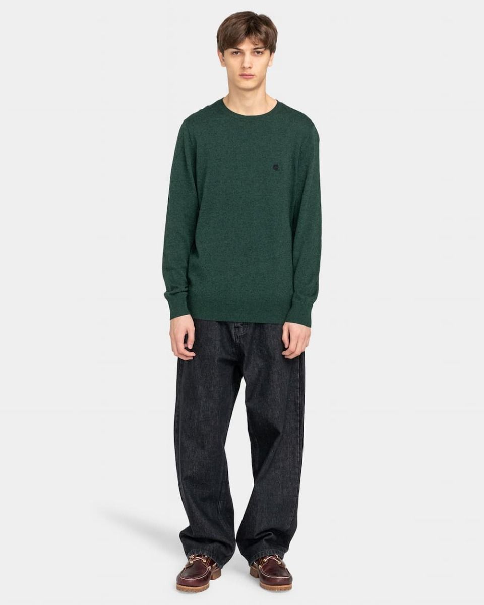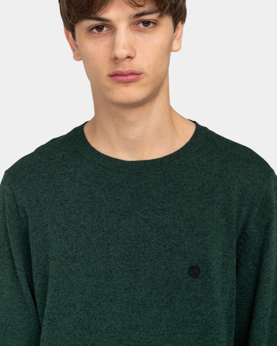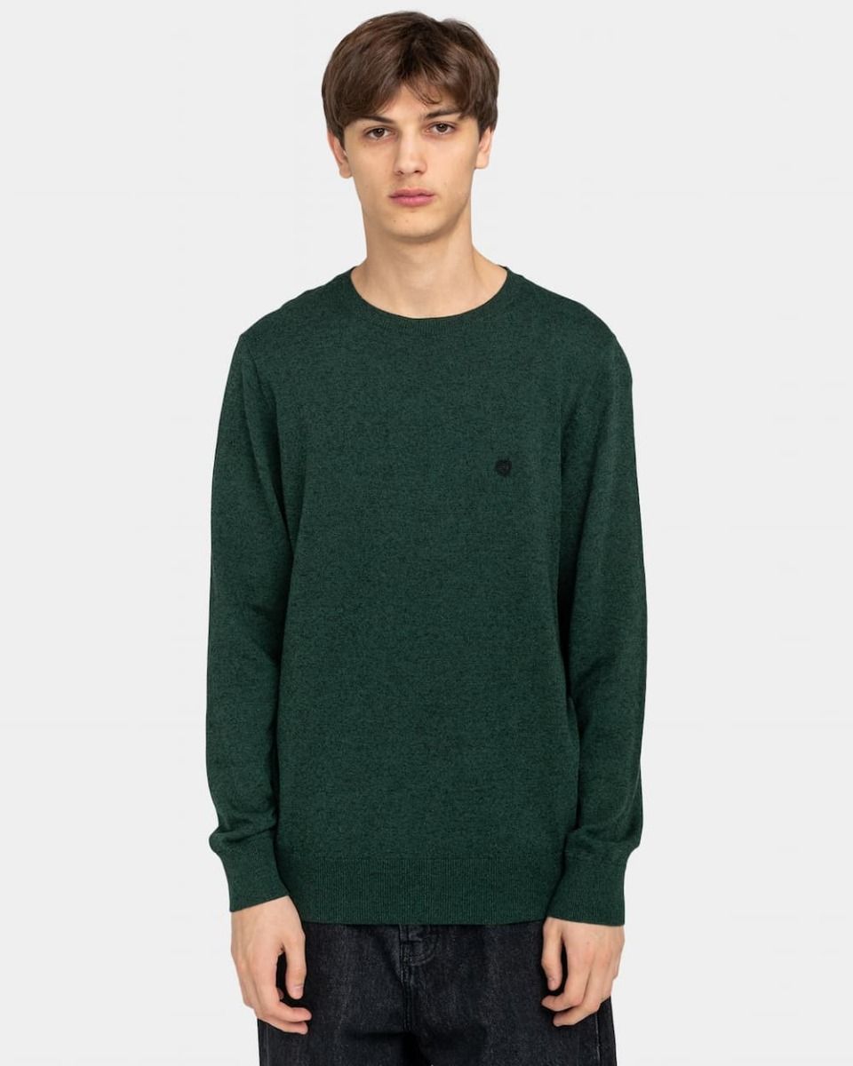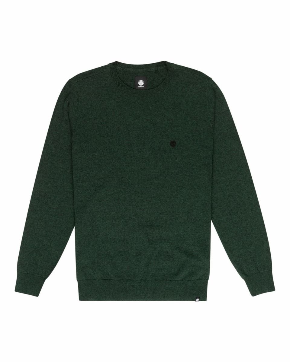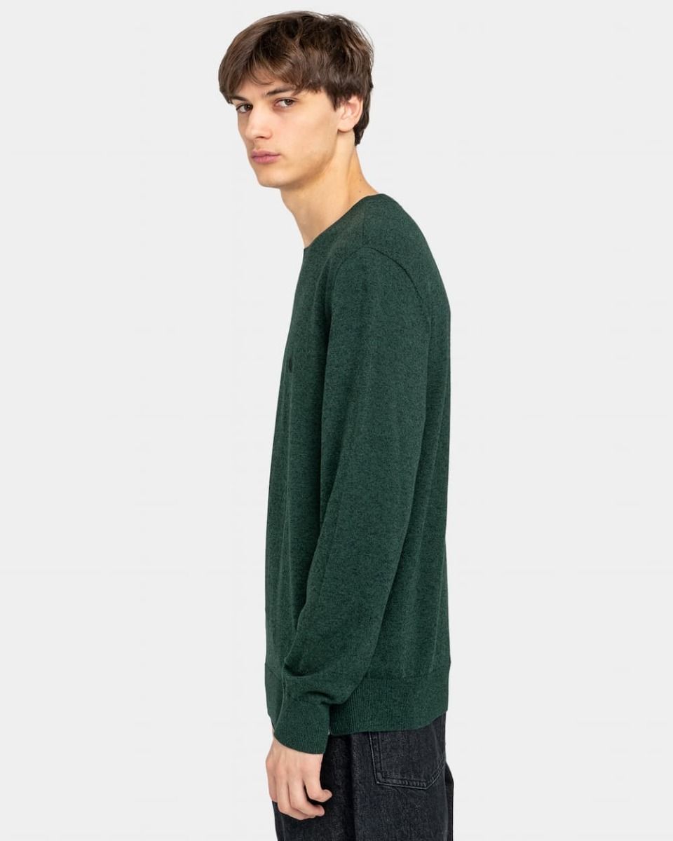 El jersey sostenible para hombre Eco Sweater en tono verde oscuro (Dark Green) de Element está confeccionado con tejido ecológico de 100% algodón reciclado 12GG.
