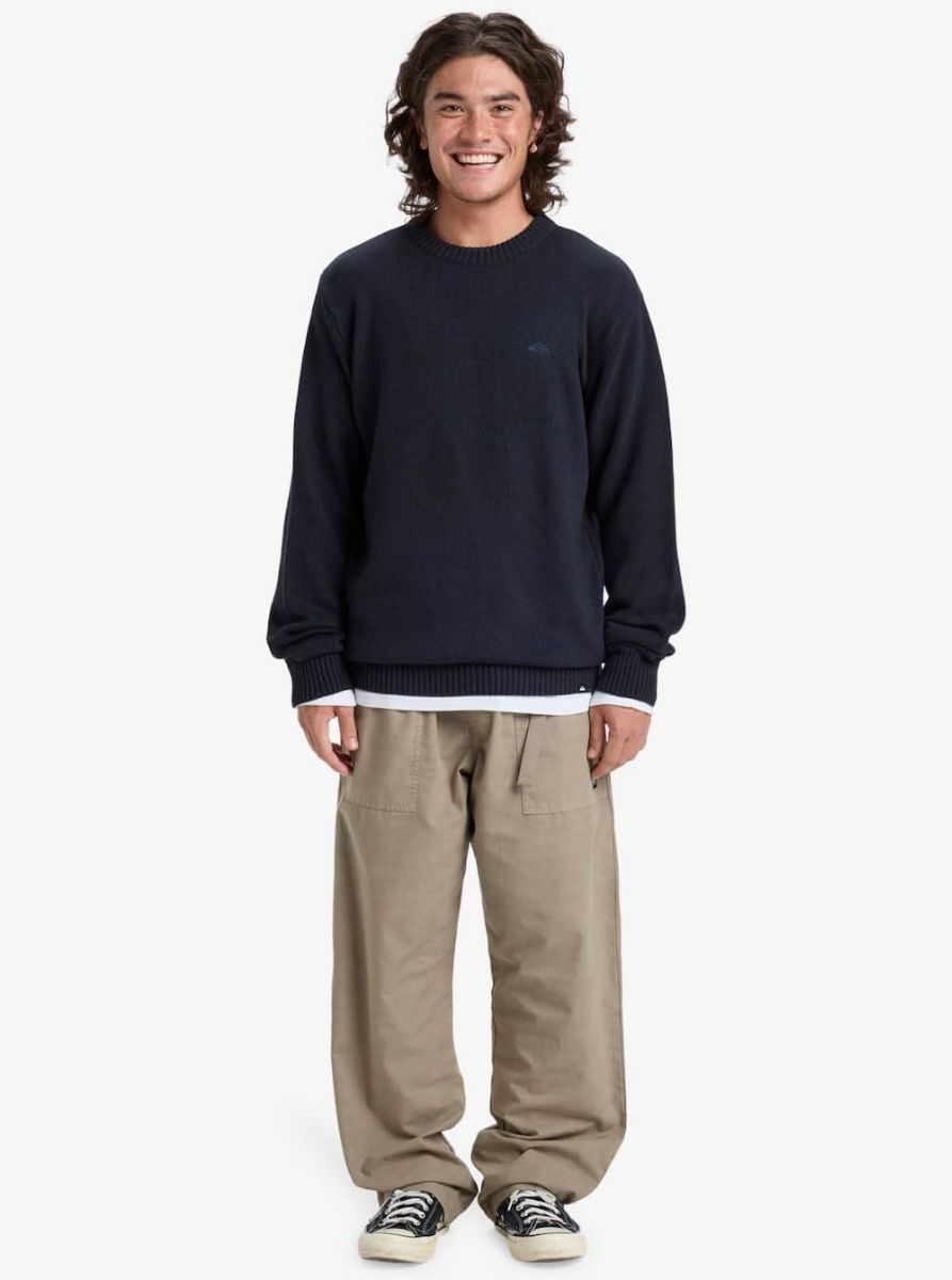 En el pecho, el logo de Quiksilver aparece bordado en tono azul oscuro a juego con el color base del suéter, aportando una presencia discreta pero auténtica. Además, incorpora etiqueta de tela reciclada en el bajo, como parte del compromiso de la marca con la sostenibilidad.