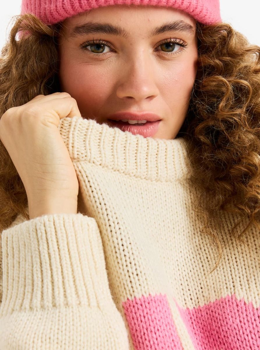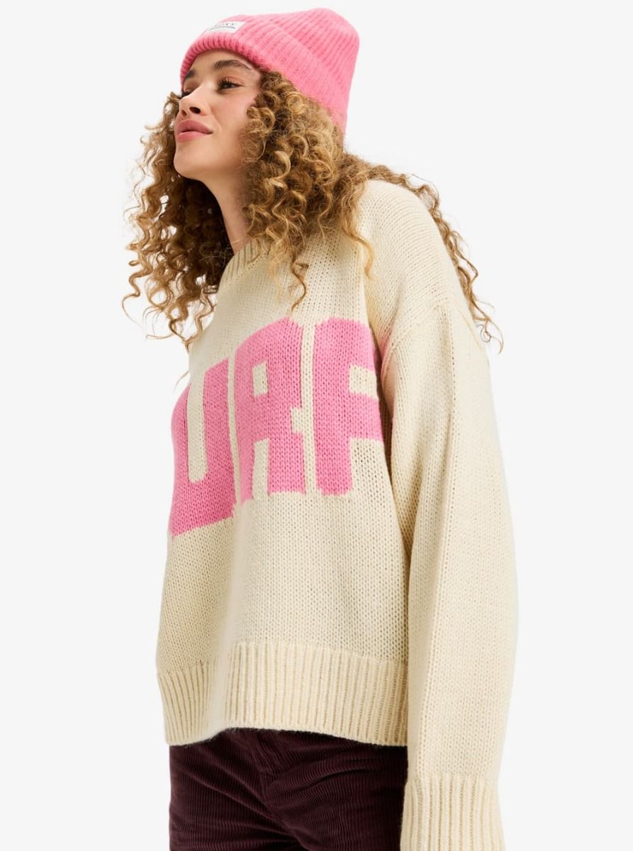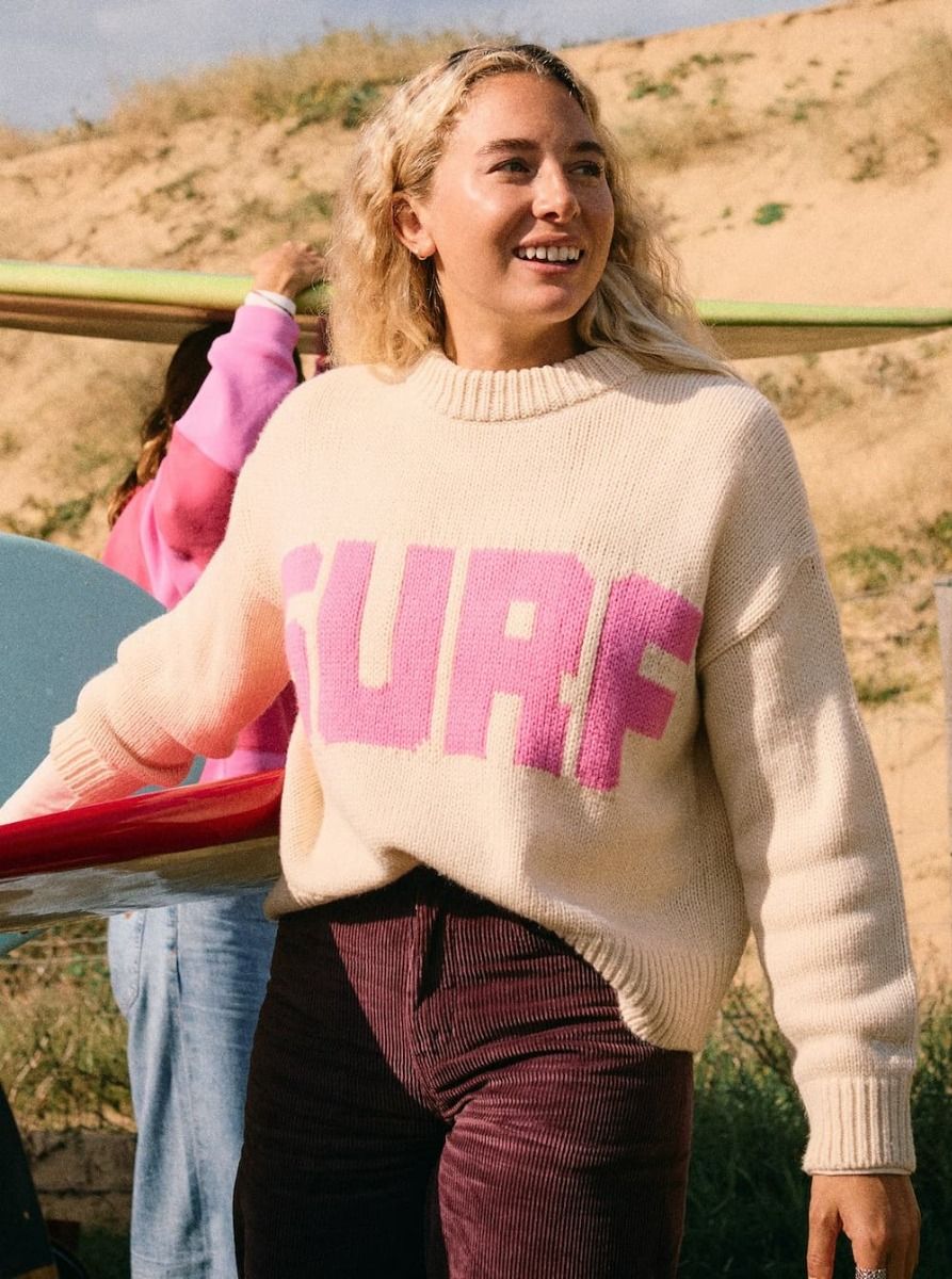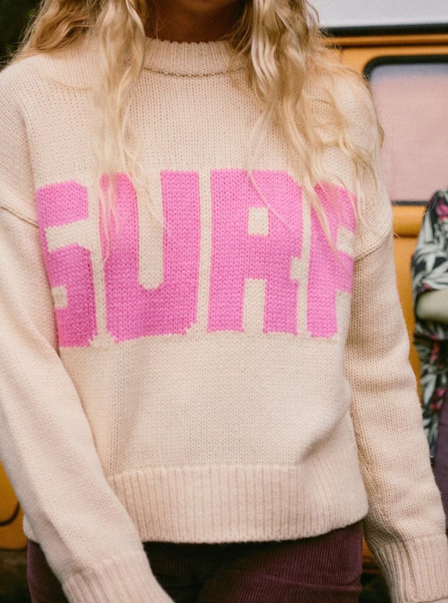 Gráfico Intarsia de gran formato: “SURF” en el frontal y “SNOW” en la espalda en tono rosa, un guiño directo al universo de la marca y a su espíritu outdoor.