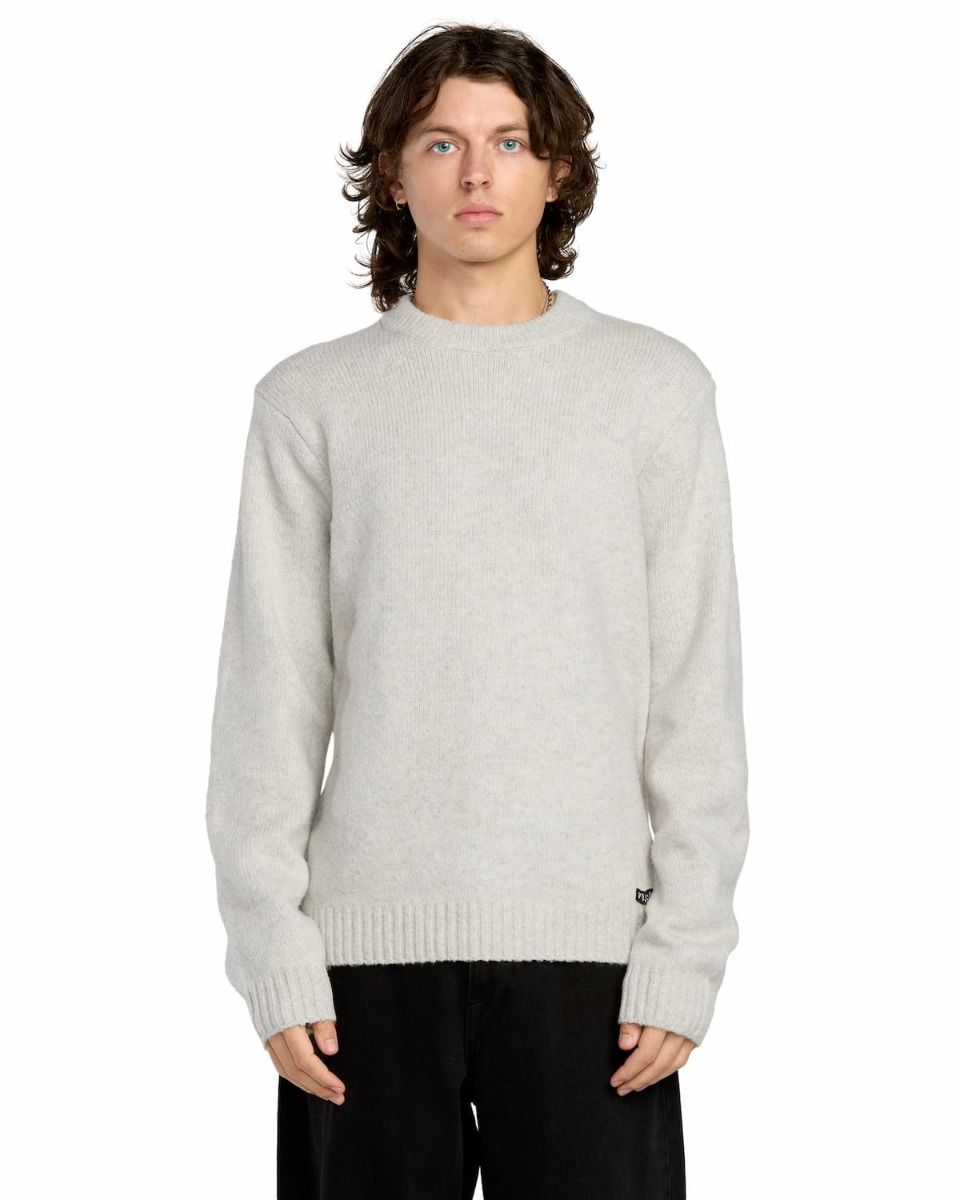 Este suéter grueso color blanco hueso de corte clásico cuenta con cuello redondo clásico, punto canalé en puños y dobladillo, hilo jaspeado y un parche de Volcom tejido en la parte inferior.