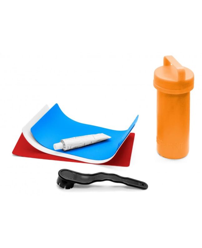 El kit de reparación para tabla de paddle surf hinchable Kohala SUP incluye tubo contenedor de viaje, parches de PVC, tubo de pegamento especial PVC ulta resistente y una llave para apretar la válvula.