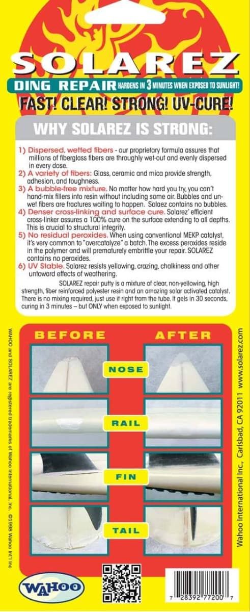 La masilla reparadora SOLAREZ es una mezcla de resina de poliéster transparente, resistente al amarilleamiento, de alta resistencia y reforzada con fibra, y un increíble catalizador activado por la luz solar. No es necesario mezclarla, solo hay que utilizarla directamente del tubo. Se gelifica en 30 segundos y se cura en 3 minutos, pero SOLO cuando se expone a la luz solar. La fórmula patentada garantiza que millones de fibras de vidrio se humedezcan completamente y se dispersen de manera uniforme en cada dosis.