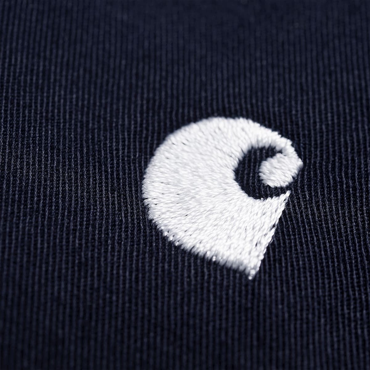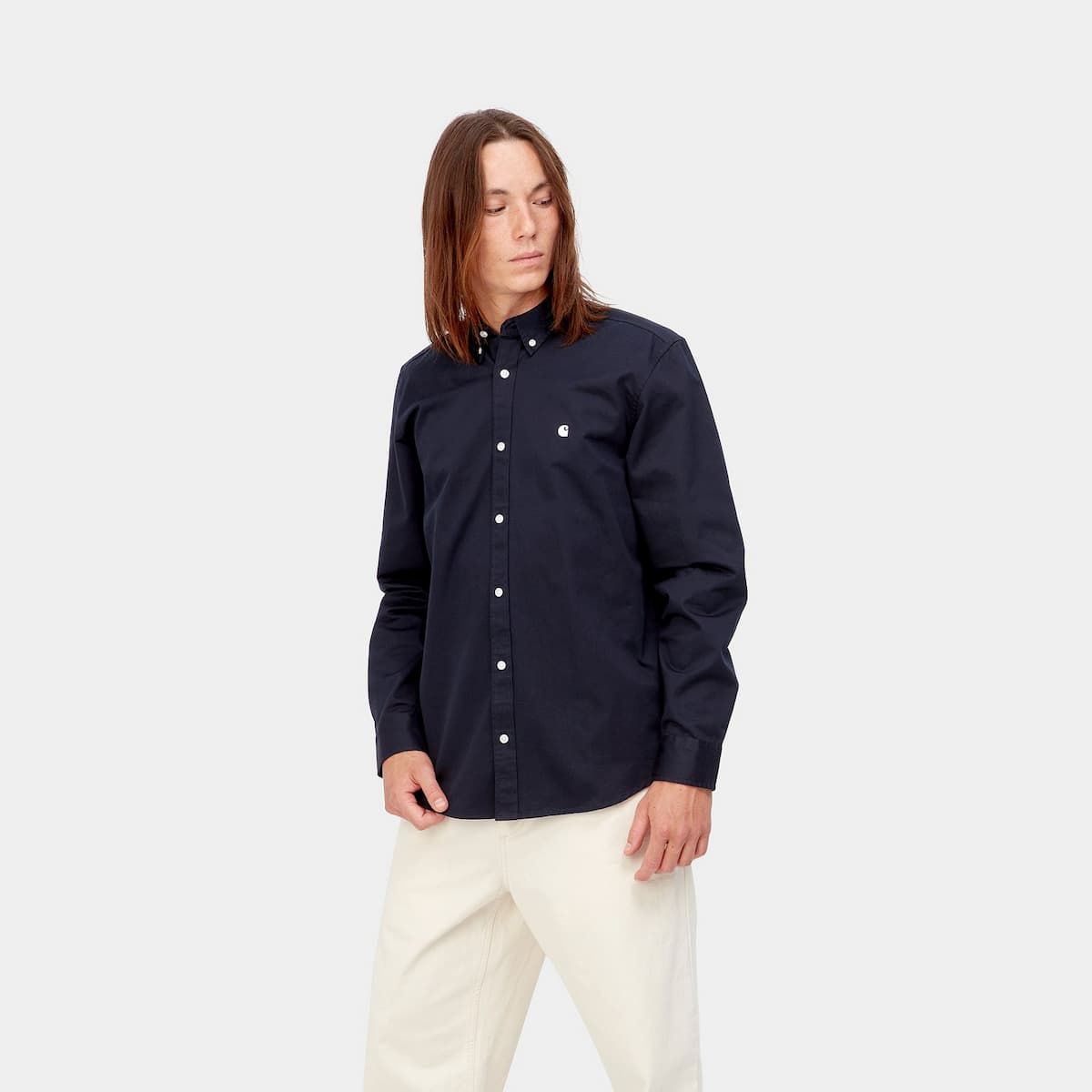 La camisa de manga larga para hombre Madison en azul marino con detalles en blanco cera de Carhartt WIP está confeccionada con 100% sarga de algodón de peso medio sometida a lavado intenso.