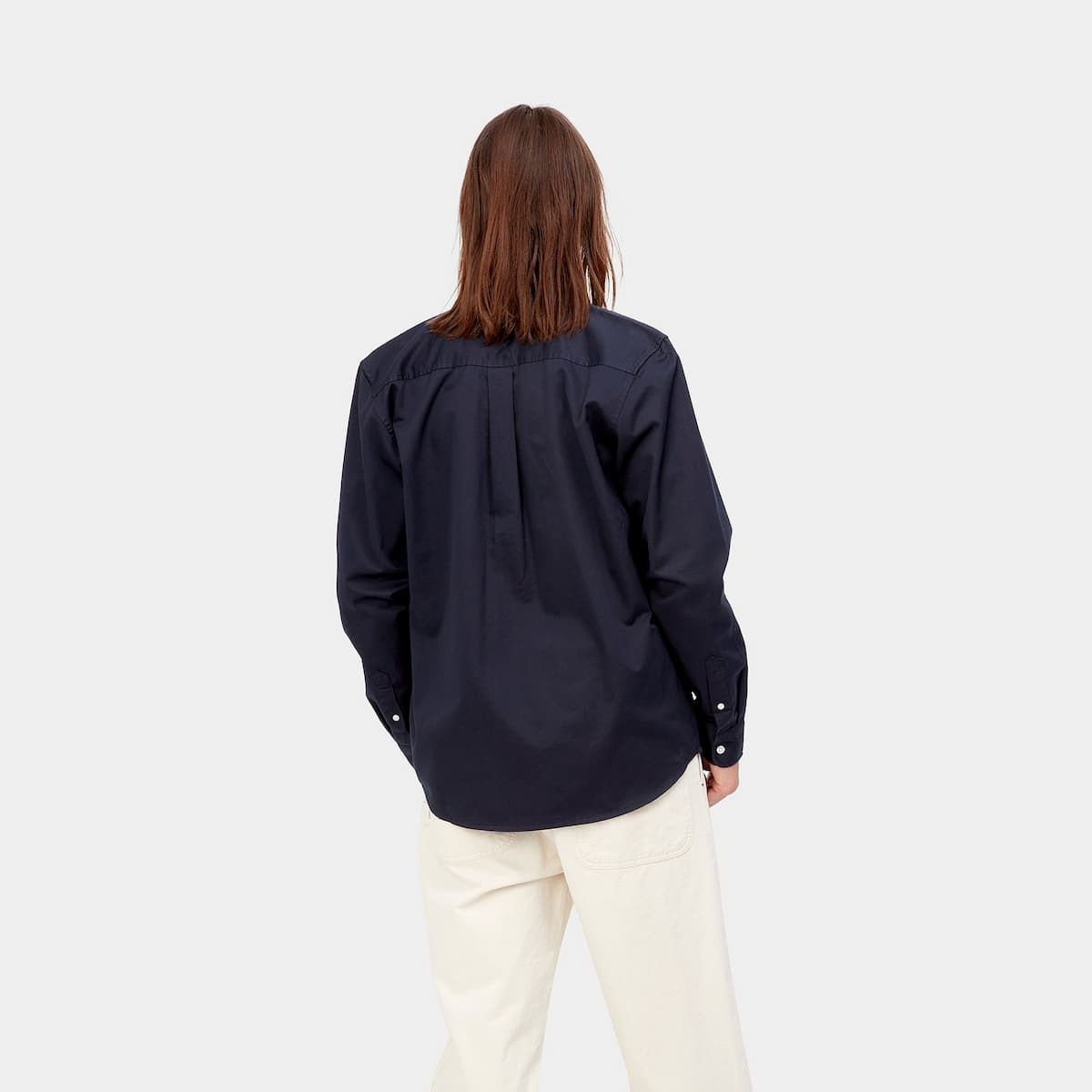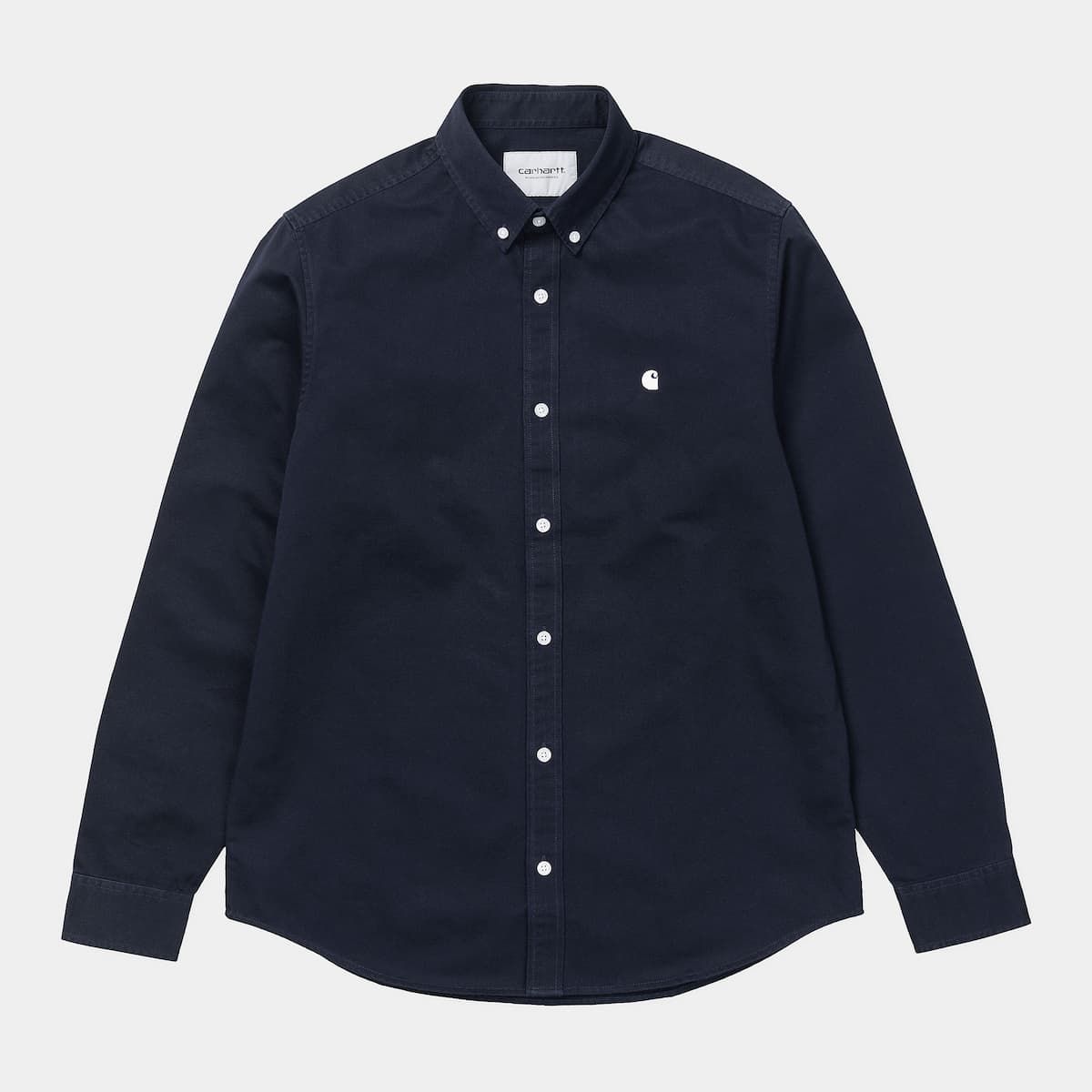 Esta camisa clásica de ajuste regular cuenta con cuello de botones, manga larga, cierre de botonadura en contraste, dobladillo curvado, etiqueta rectangular Carhartt WIP y el logotipo de la «C» de Carhartt bordado en la parte izquierda del pecho.