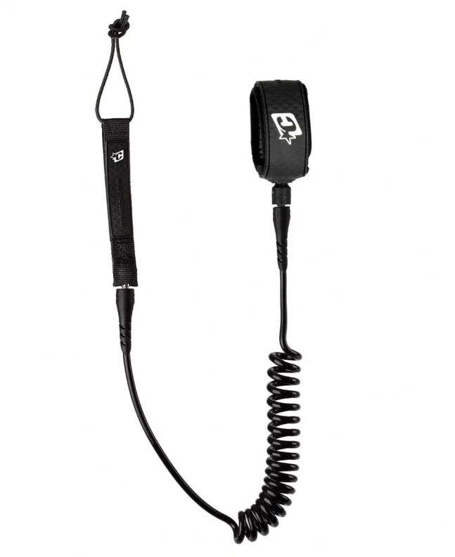 Leash de foil surfing Creatures Foil Knee Coil 6' en color negro. Diseño en espiral, puño de rodilla y máxima resistencia.