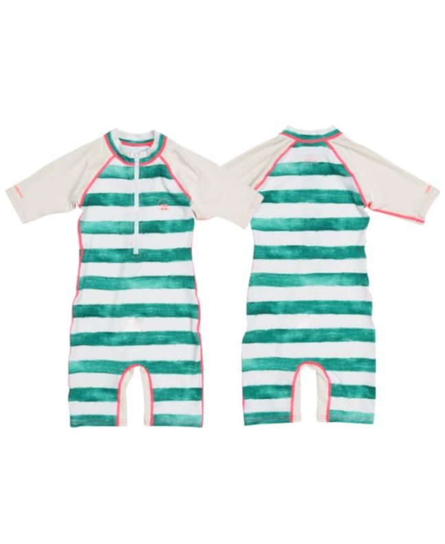 La licra de protección solar para niñas de 2 a 4 años Sweet Toddler en color blanco con estampado a rayas verdes (Maldive Stripe) de Billabong está confeccionada con polielastano de alto rendimiento.