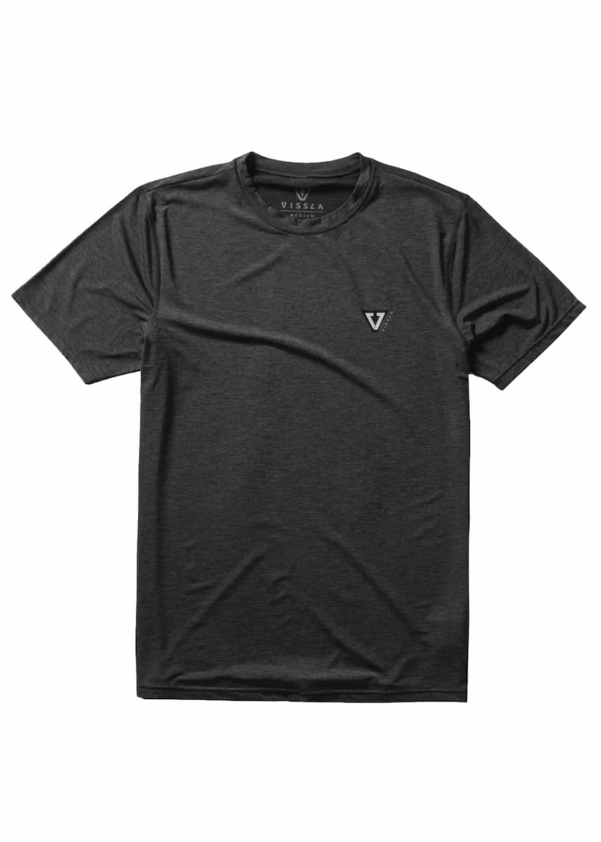 La camiseta de protección solar de manga corta para hombre Twisted ECO SS Lycra Rashguard UPF 50+ en tono negro brezo (Black Heather) de Vissla está confeccionada con 85% poliéster reciclado y 15% elastano reciclado (5oz).