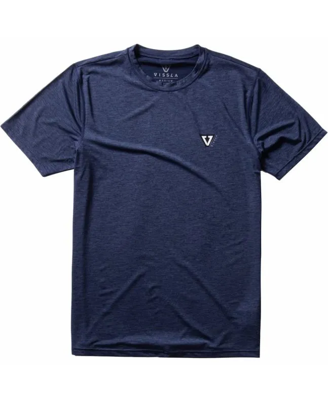 La camiseta de protección solar de manga corta para hombre Twisted ECO SS Lycra Rashguard UPF 50+ en tono azul marino oscuro jaspeado (Dark Navy Heather) de Vissla está confeccionada con 85% poliéster reciclado y 15% elastano reciclado.