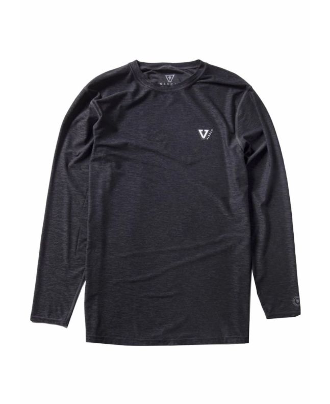 La camiseta de protección solar de manga larga para niño Youth Twisted ECO Long Sleeve Lycra UPF 50+ en tono negro jaspeado (Black Heather) de Vissla está confeccionada con 85% poliéster reciclado y 15% spandex reciclado (5oz).