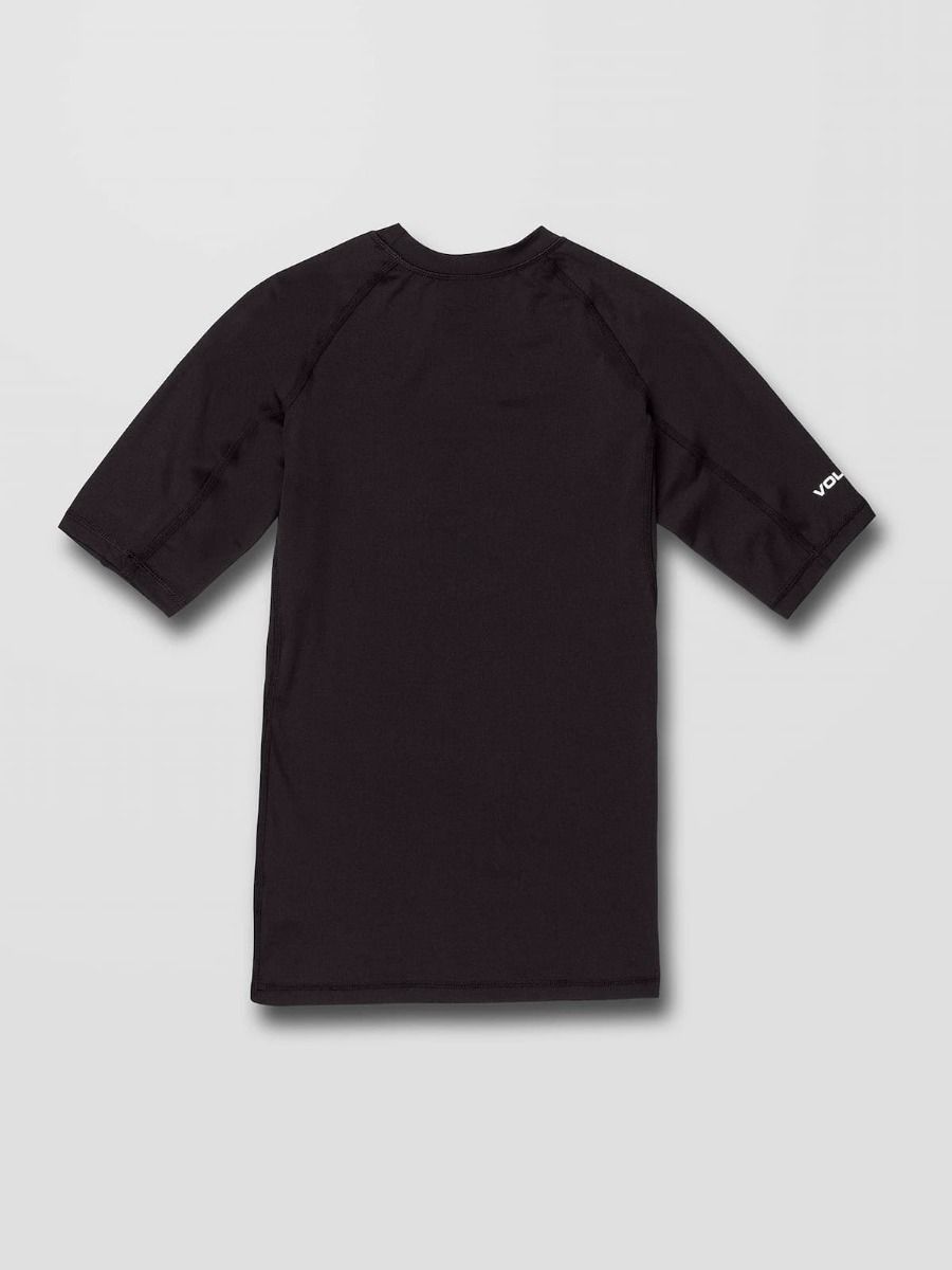 La licra de protección solar con manga corta para hombre Lido Solid en negro tiene el sello de garantía Volcom en el interior.
