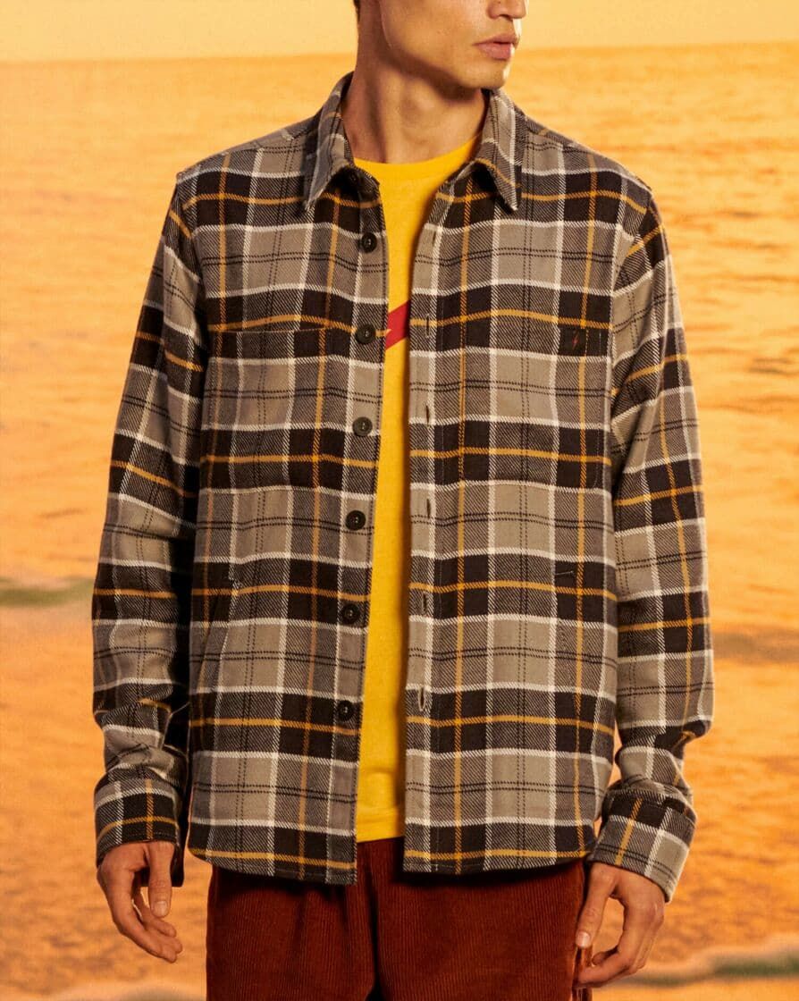 La sobrecamisa de franela OWL Overshirt gris a cuadros para hombre tiene una etiqueta de garantía Lightning Bolt en el interior.