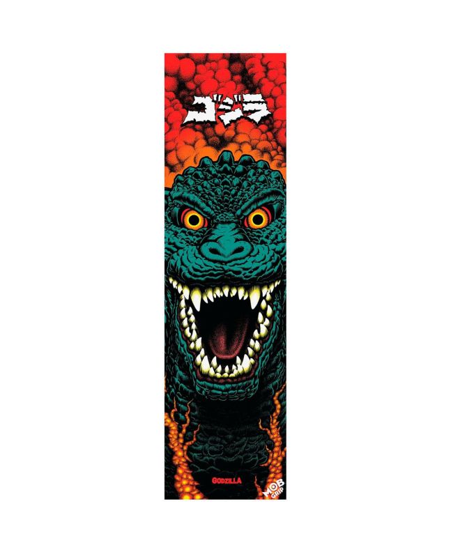 La lija de skate Godzilla Destroyer 9" x 33" de Mob Grip presenta un gráfico exclusivo del Rey de los Monstruos de la Colección Santa Cruz Skateboards x Godzilla .