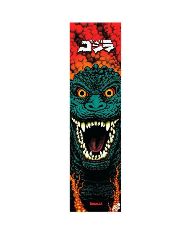 La lija para tabla de skate Godzilla Destroyer Mob Skateboard Griptape 9" x 33" forma parte de la colaboración entre MOB Grip, Santa Cruz Skateboards y el universo Godzilla.