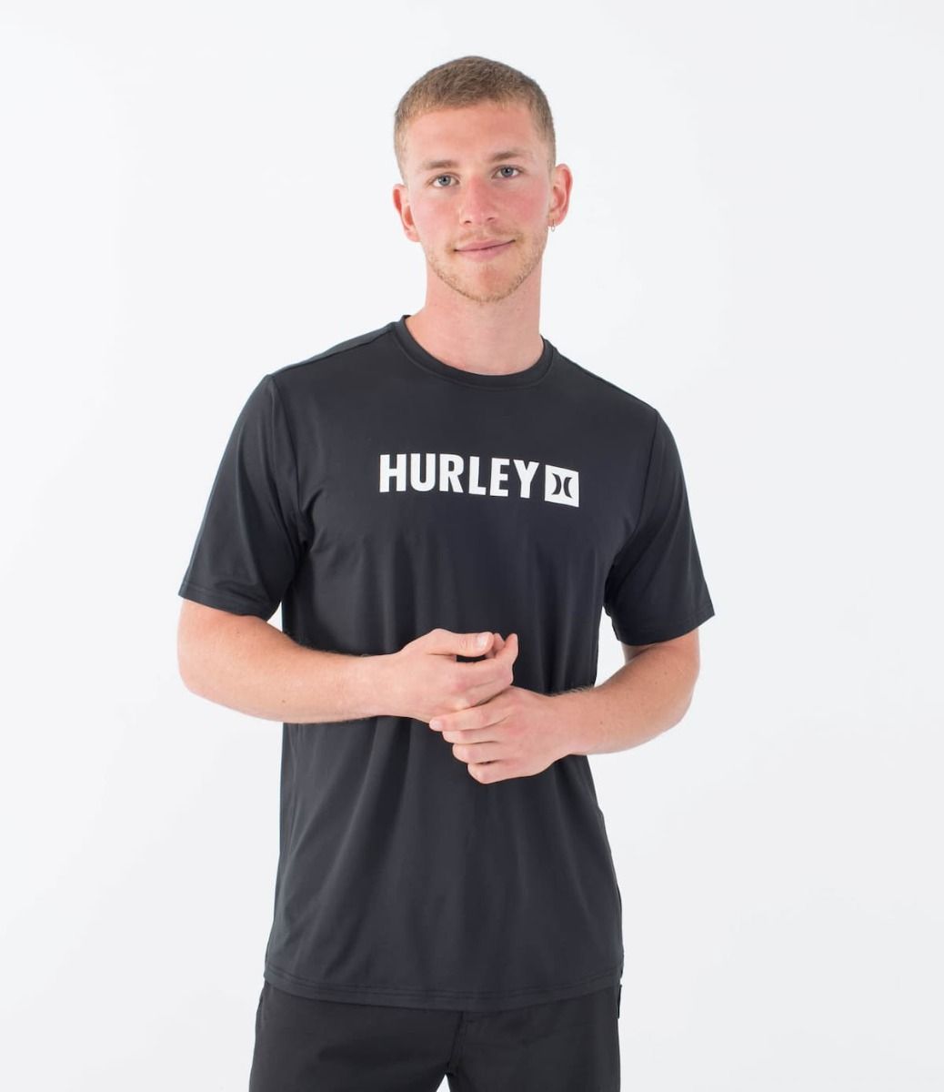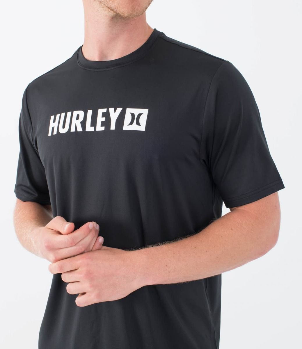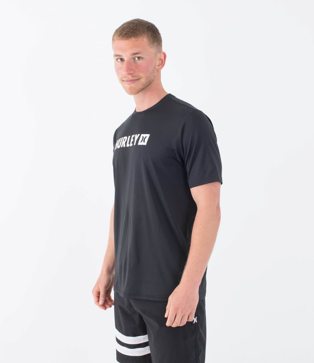 Esta camiseta antiabrasión negra de ajuste clásico cuenta con manga corta, cuello redondo, tejido híbrido para que puedas utilizarla tanto dentro como fuera del agua, protección solar UPF 50+, junto con el logo de Hurley serigrafiado en color blanco en el pecho.
