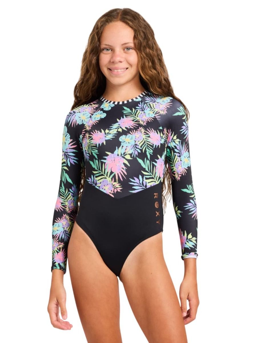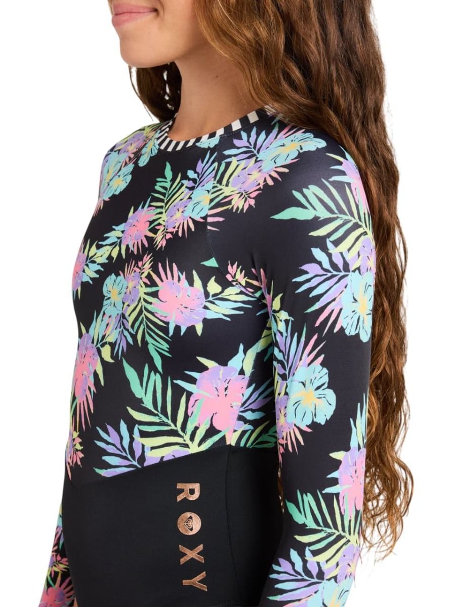 Licra de surf tipo bañador entero de manga larga Roxy Girl Active Onesie en color Antracita Floral para niña (6-16 años)