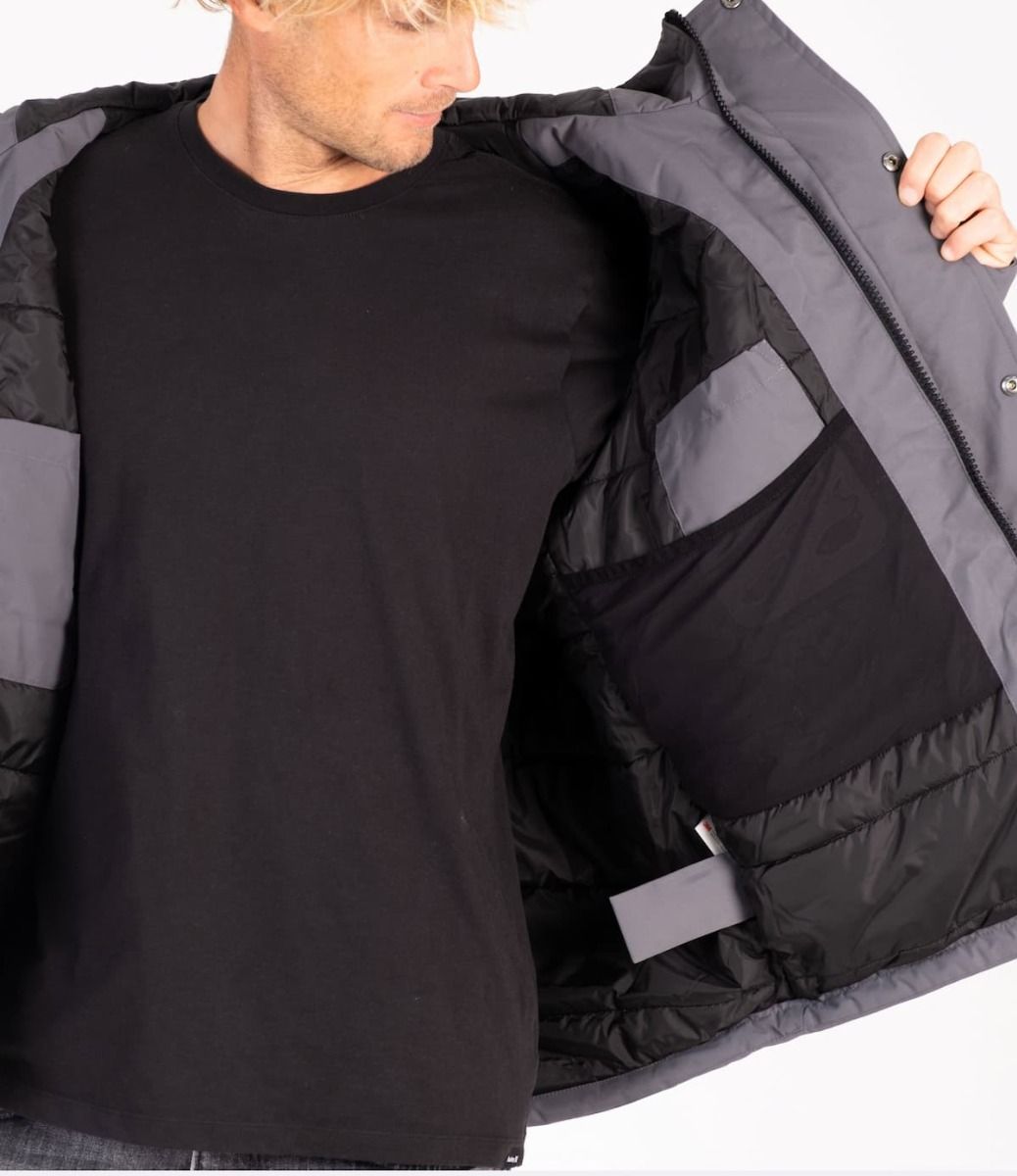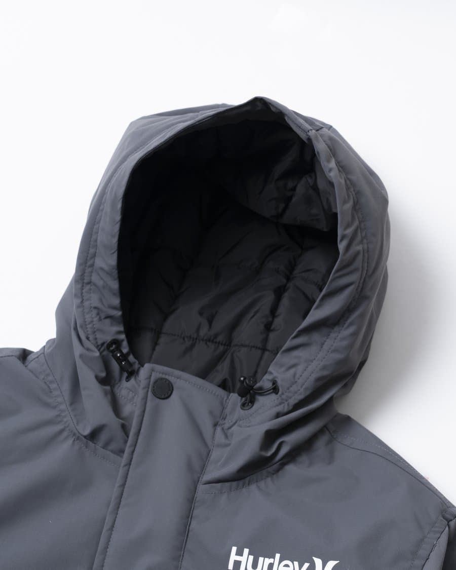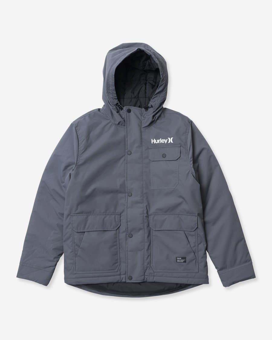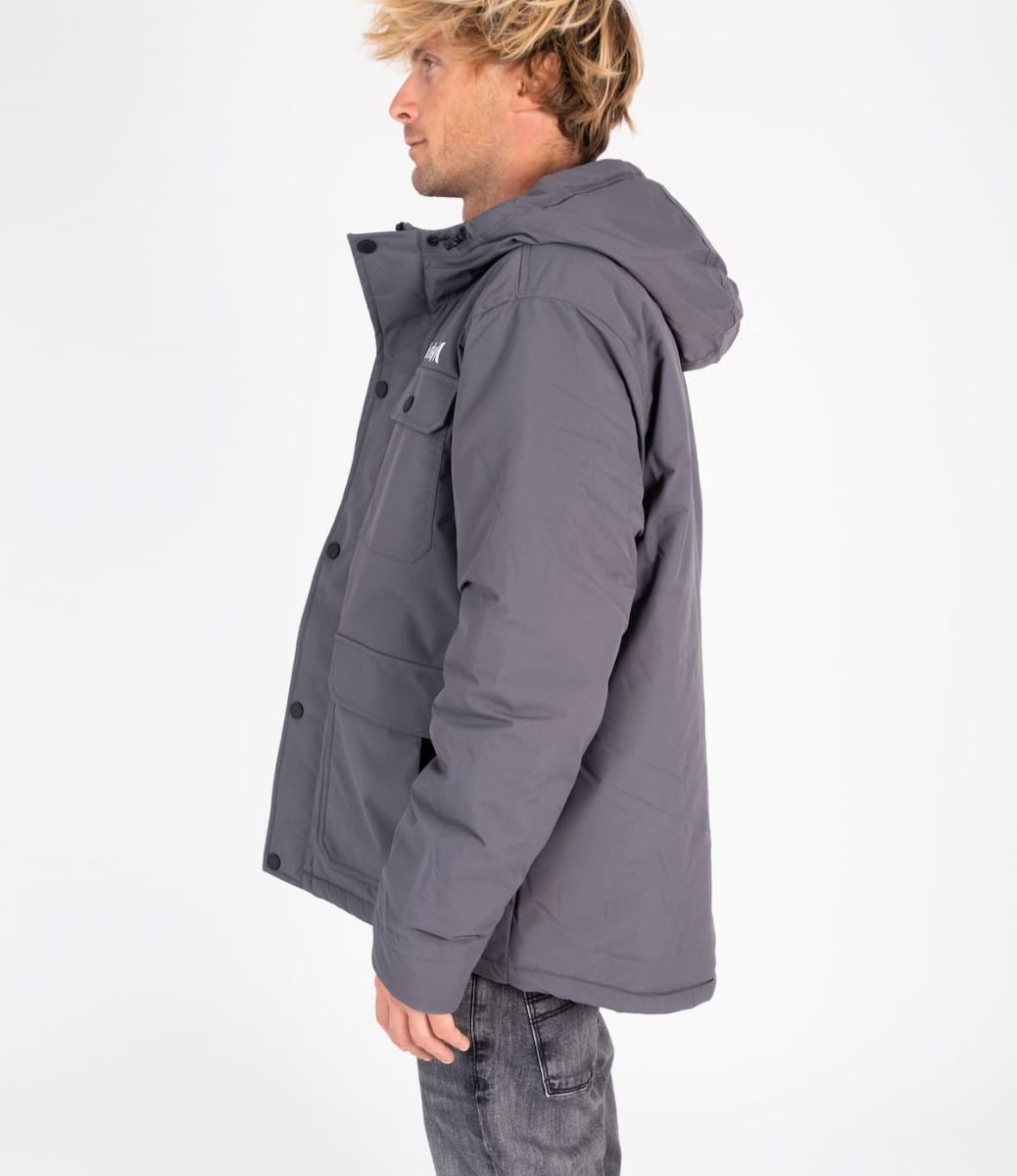La chaqueta acolchada con capucha Idyllwild 3M Parka gris para hombre tiene una etiqueta de garantía Hurley tejida en bolsillo delantero izquierdo.