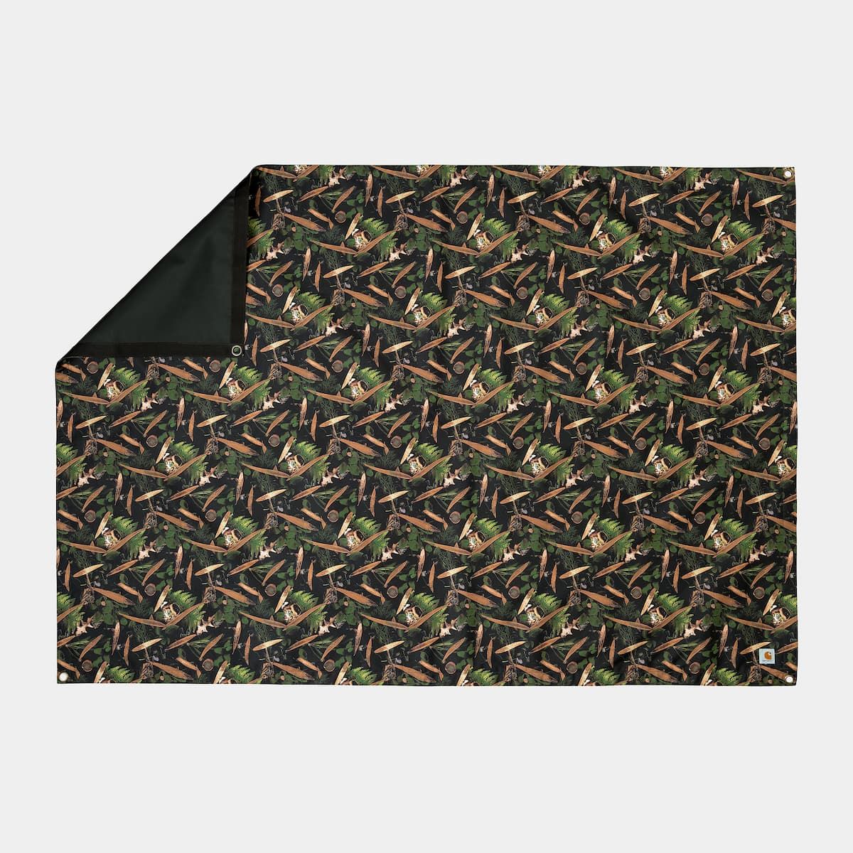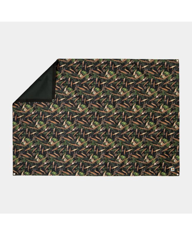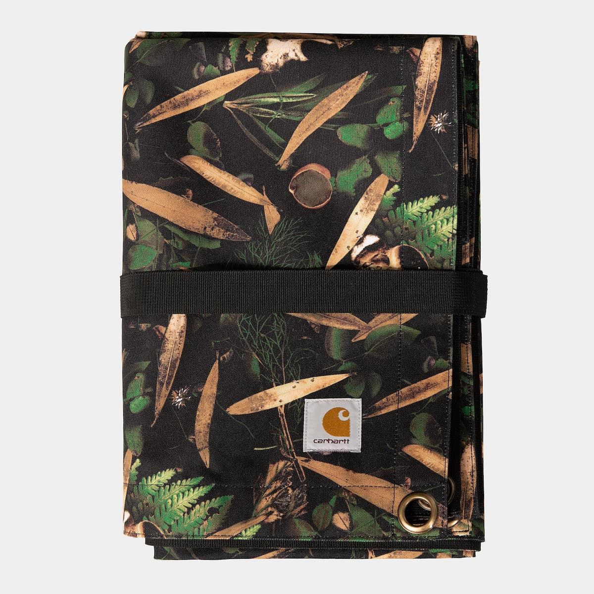 Este mantel de picnic cuenta con ojales de latón, estampado integral de temporada inspirado en impresiones lumínicas, una práctica correa de transporte con cierre de velcro y una etiqueta cuadrada con el logo de Carhartt tejida en un lado.