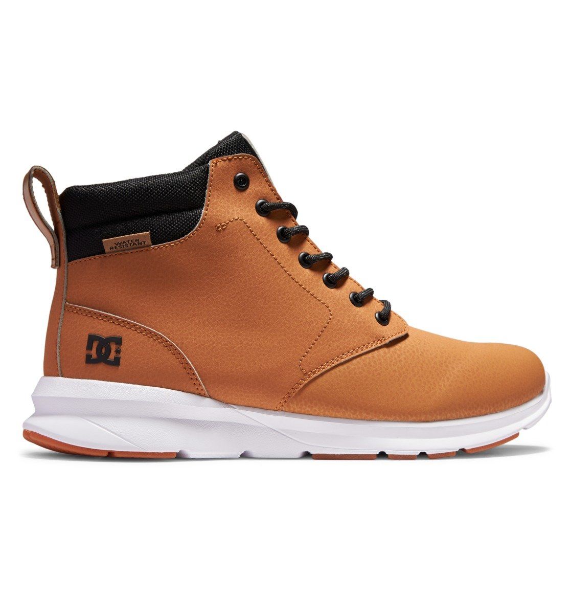 Las zapatillas altas para hombre Mason 2 de DC Shoes en color marrón (Wheat Black) con la suela blanca están confeccionadas con la parte superior de cuero resistente al agua e interior Foil Strobel para añadir calor.