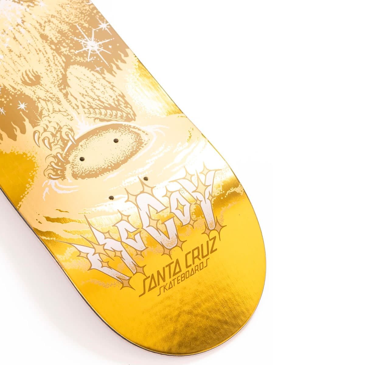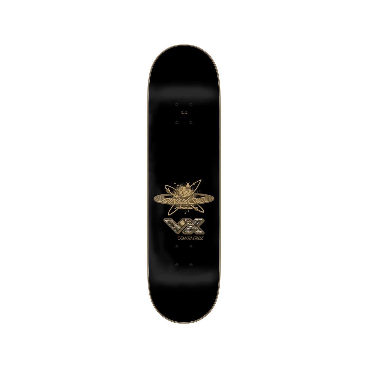 Tabla de skate Santa Cruz VX de Maurio McCoy con shape twin, cóncavo ATV y gráfico dorado metalizado. Más pop, más resistencia y control total.