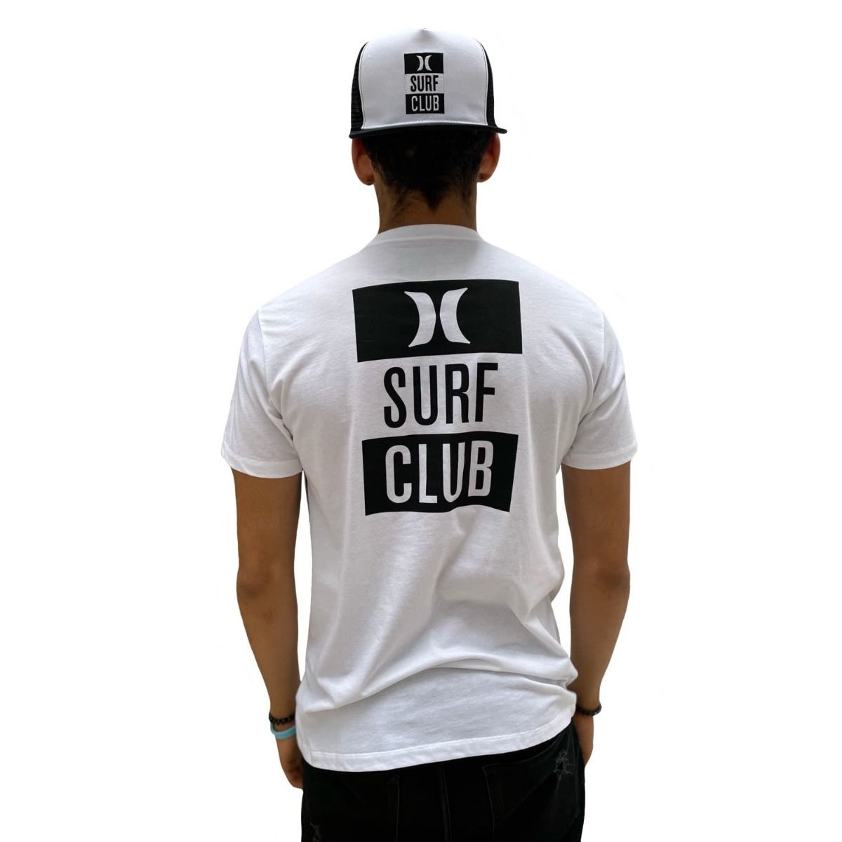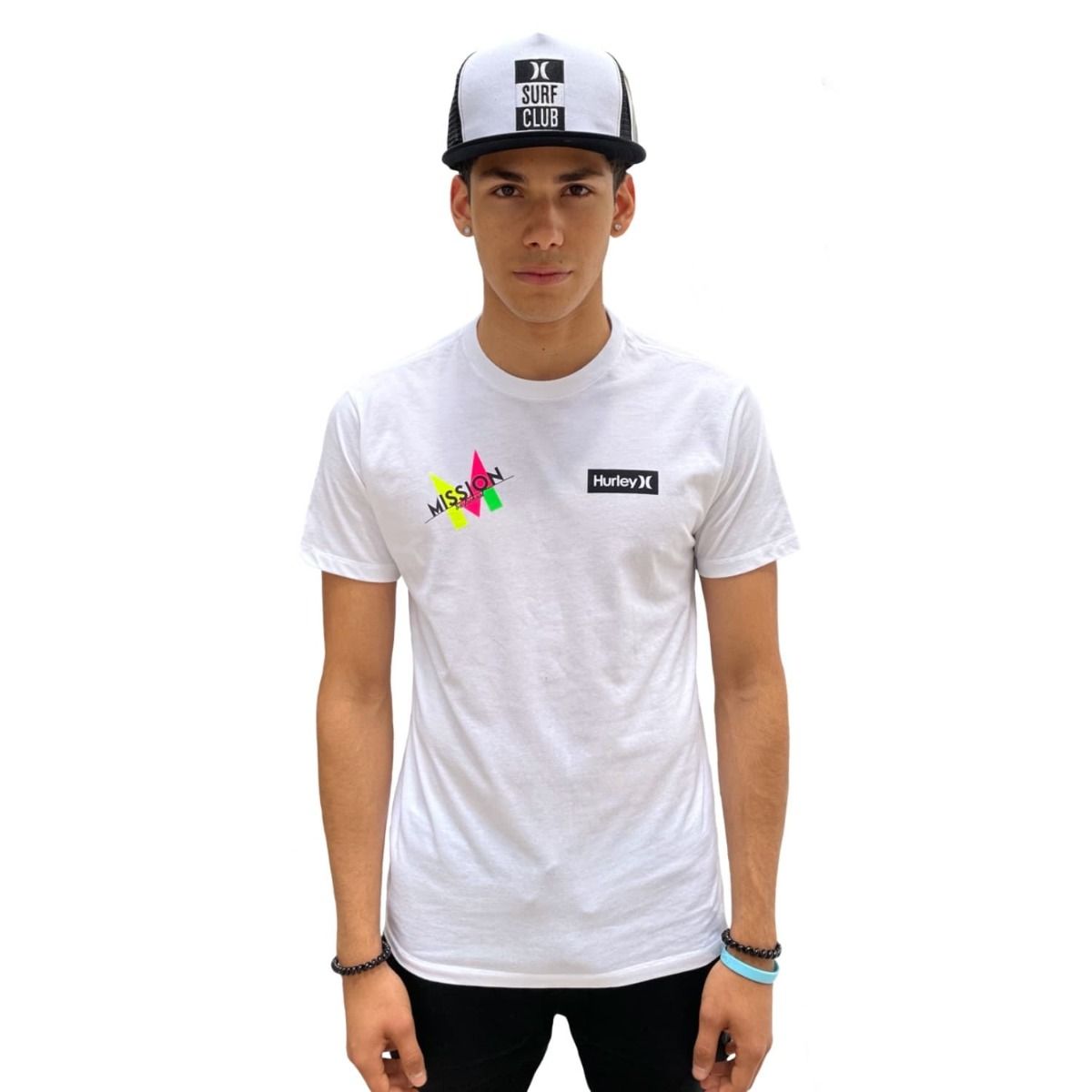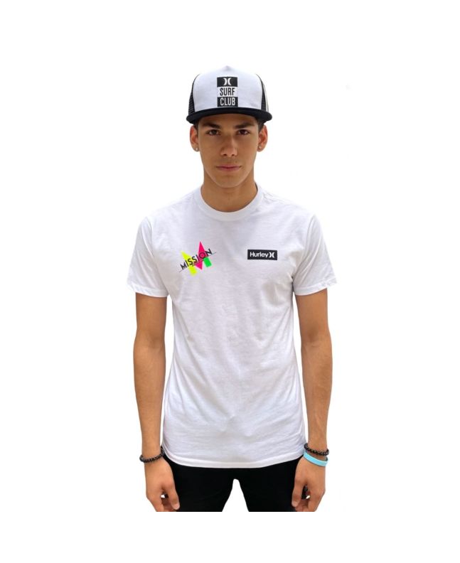 Esta camiseta, fruto de la colabración entre nuestra escuela de surf y Hurley, cuenta con manga corta, cuello redondo, punto canalé en mangas y cintura, los logos de Mission Surf School y Hurley estampados en la parte delantera y serigrafía Hurley Surf Club en la espalda.
