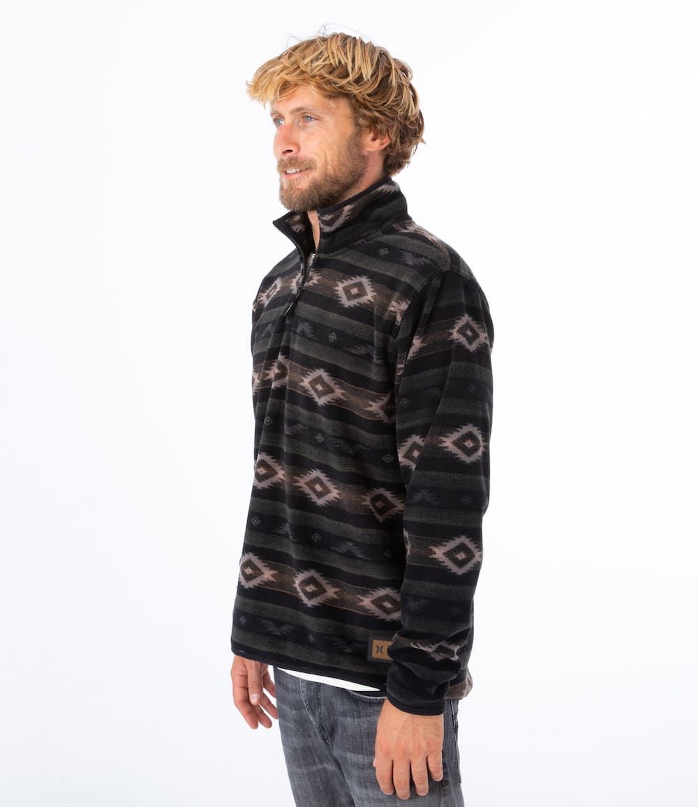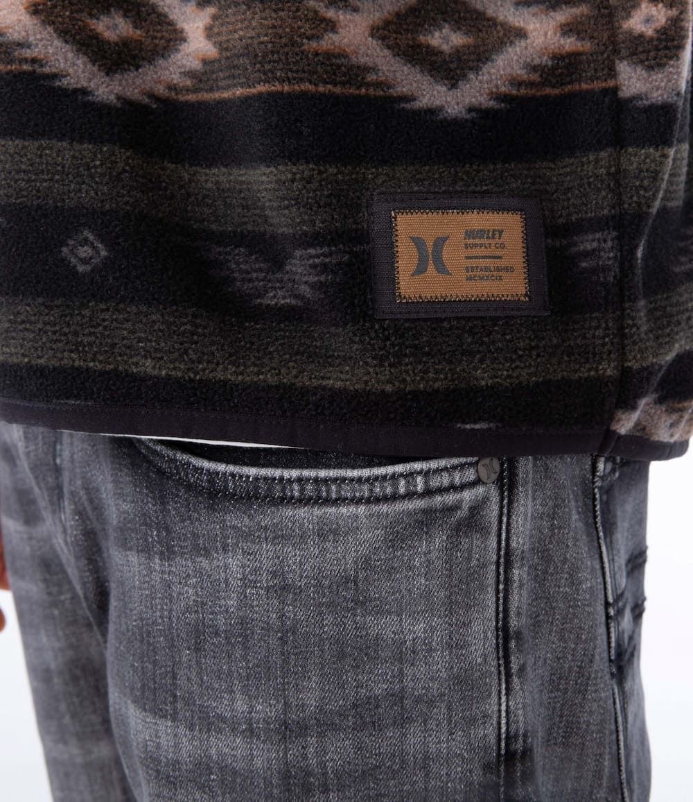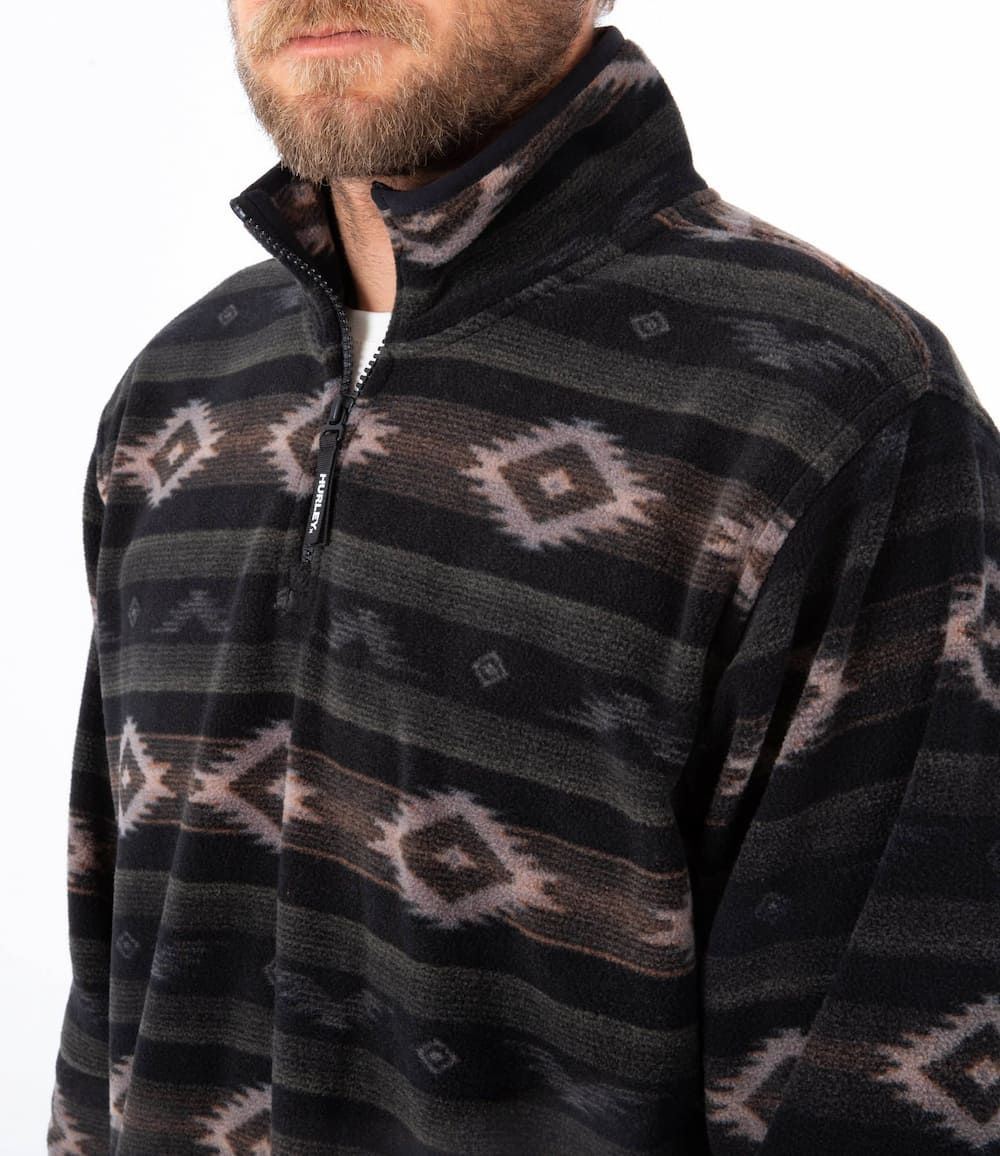 Esta sudadera cuenta con tejido de forro polar suave y ligero (186g), estampado en toda la prenda, cuello alto, cierre de cremallera parcial con tirador Hurley, puños y dobladillo inferior con ribete elástico y un parche de Hurley tejido en el lado inferior izquierdo.