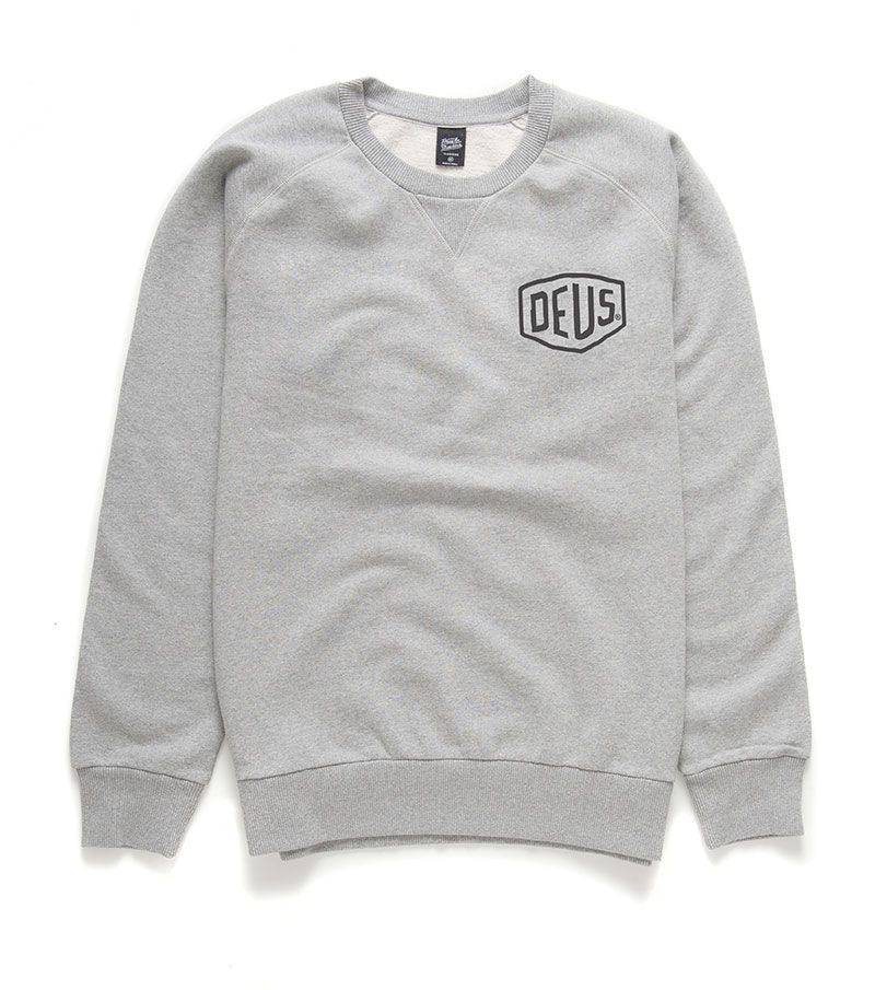 Este crew raglán gris de ajuste regular, perteneciente a la Colección Deus Ex Machina Classics, cuenta con cuello redondo, forro interior polar cepillado de algodón, dobladillo inferior y puños acanalados, el logo DEUS Shield estampado en el lado izquierdo del pecho, junto con la inscripción "Deus Ex Machina Milano. Via Thaon Di Revel 3" impresa en la espalda.