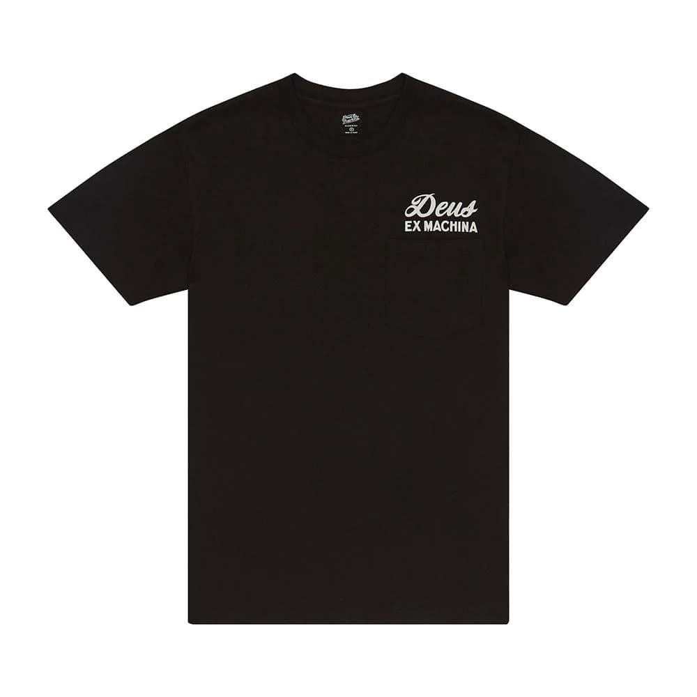 La camiseta de manga corta con bolsillo Milan Address negra tiene una etiqueta con el logo de Deus tejida en la manga izquierda.